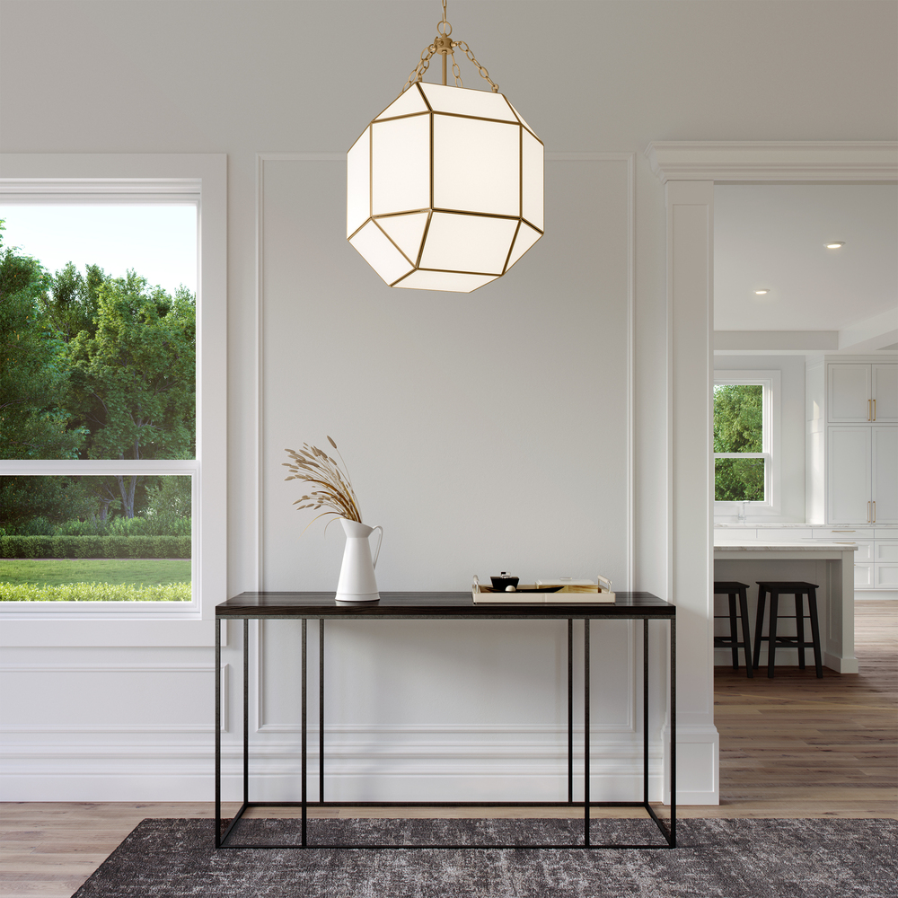 The Morrison three light indoor pendant in satin brass provides abundant light to your home, while adding style and interest. A lantern-like design with curved arms connecting to a cube-shaped frame