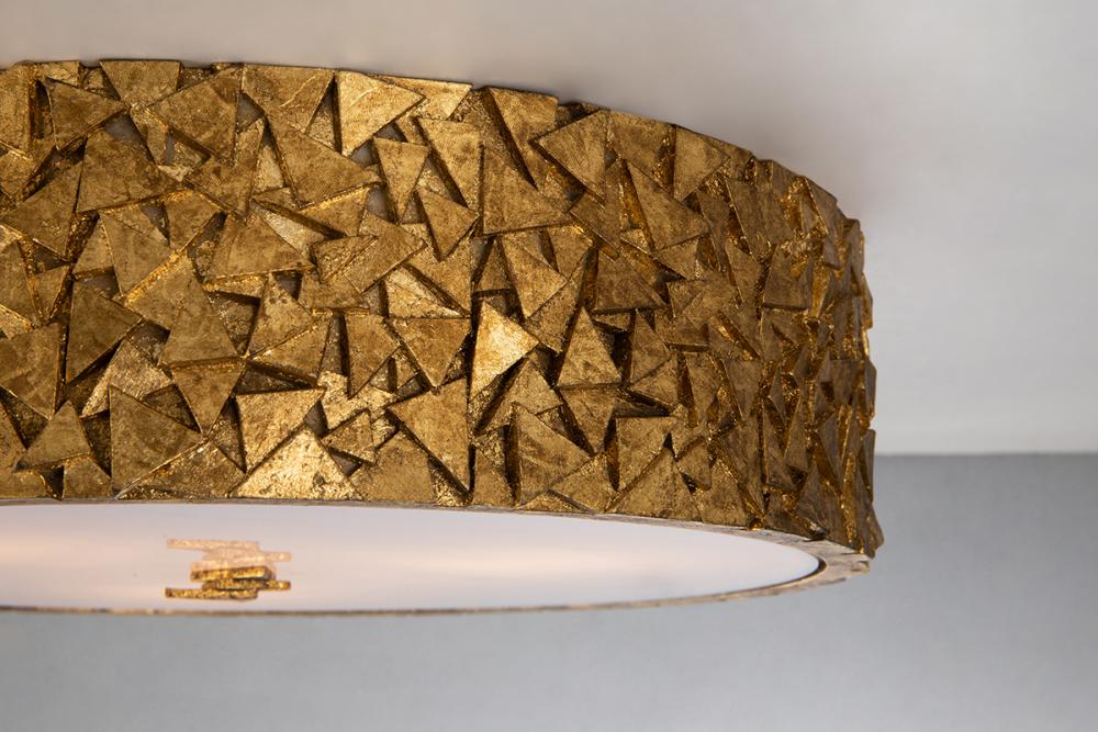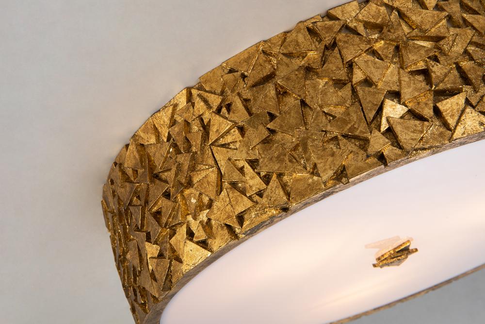 Inspired by the Mosaic collection, this 16" round antique gold 3-light flush mount blends traditional and modern design. Its diffused white glass offers crisp light, perfect for bedrooms, closets, or living rooms.