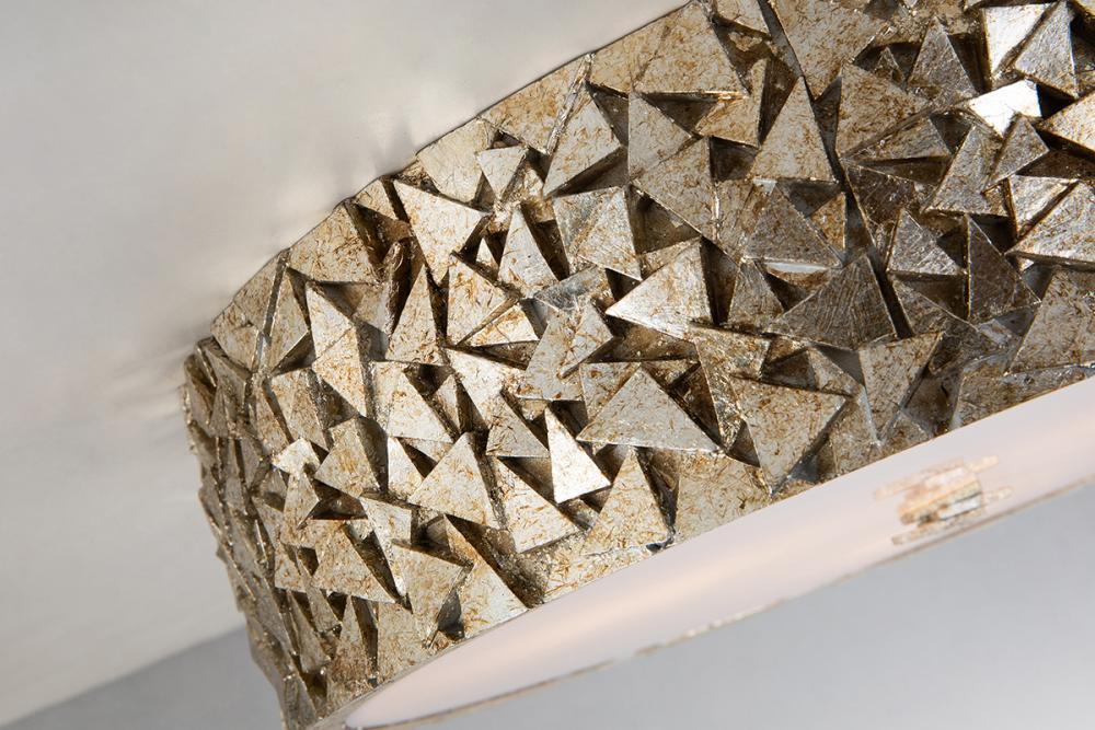 This 20" round antique silver 4-light flush mount, inspired by the Mosaic collection, blends traditional and modern styles. Diffused white glass offers flattering light for bedrooms, closets, or living rooms.