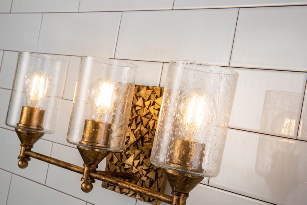 An eye-catching bath bar inspired by our Mosaic collection, with an antique gold rectangular backplate and seeded glass. This charming vanity light blends beauty and function, securely attaching to walls with matching gold details.