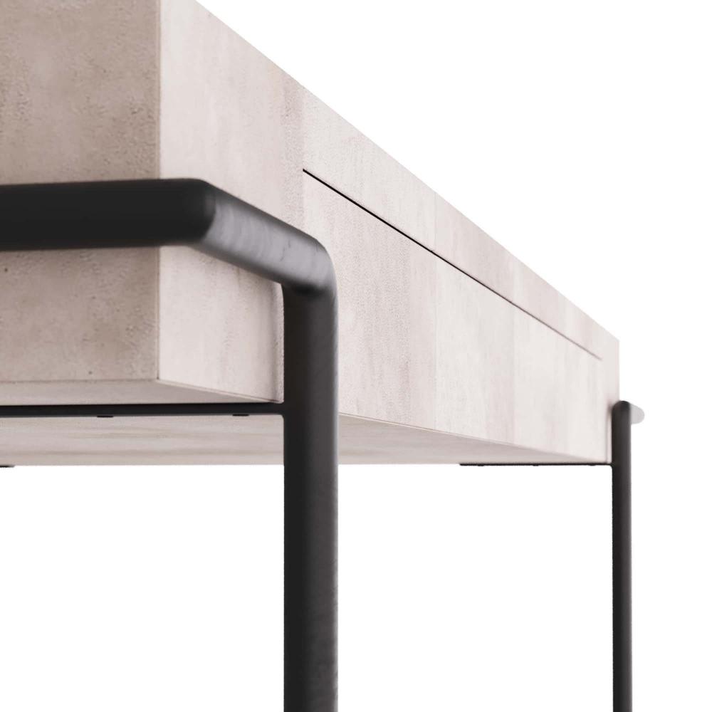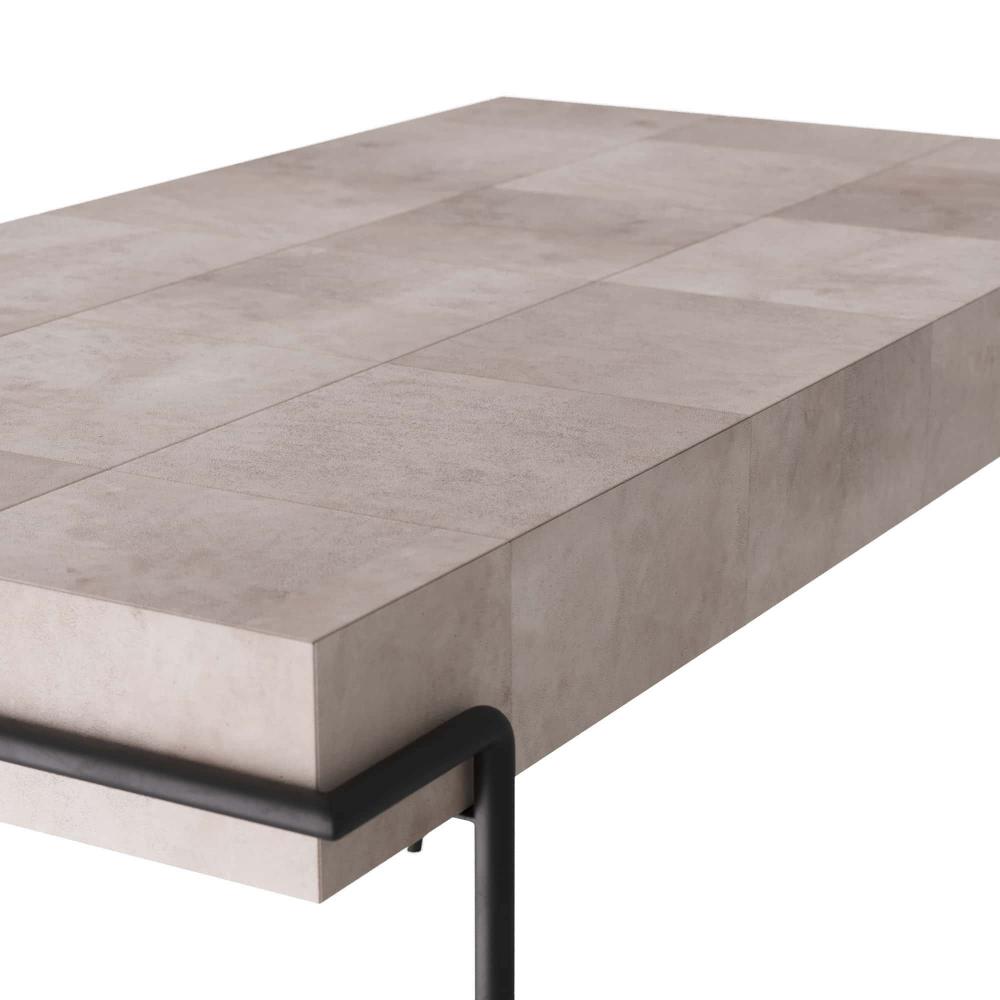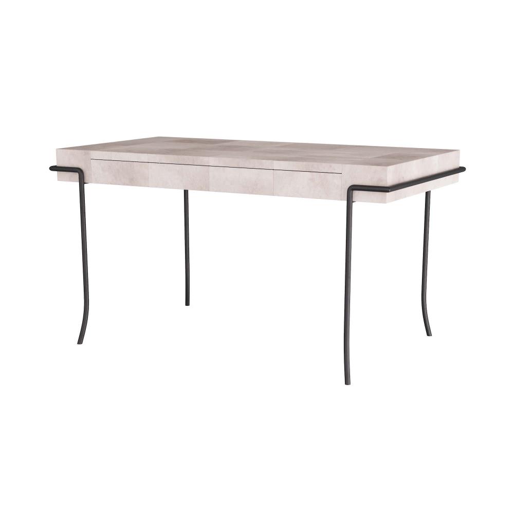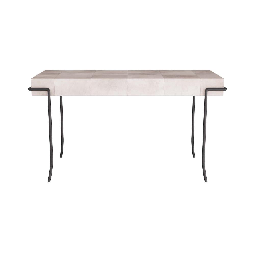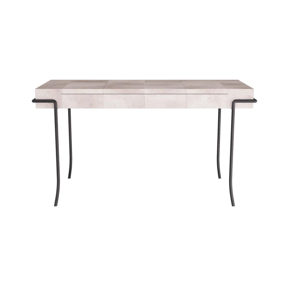 THIS HANDSOME DESK IS AMAZINGLY VERSATILE. USE IT AS A VANITY, A SOFA TABLE, A CONSOLE, EVEN A BAR. USE AS A PAIR IN A DINING ROOM FOR SERVING. SMALL ENOUGH TO USE BEDSIDE AS THE DESK IN A ROOM. THE IVORY VELLUM SURFACE LENDS LUXE TEXTURE TO ANY ROOM IN THE HOUSE. THE BLACKENED IRON LEGS ADD CONTRAST TO THE TOP. FINISH WILL VARY