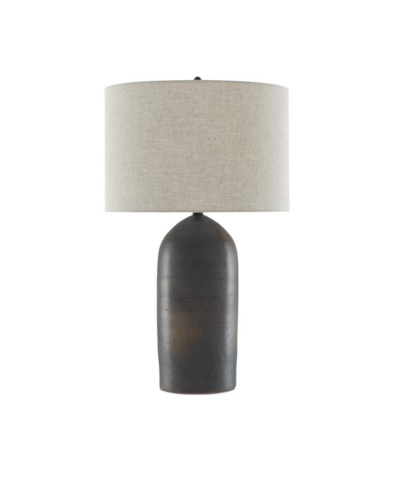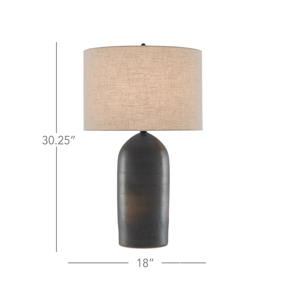 The torpedo-shaped body of the Munby Table Lamp has subtle variations in texture. Made of rust-colored and iron-hued ceramic, dark gray tones dominate on the lamp's body with rust patches showing through. Metal hardware in a semi-glossy black finish and a matching finial secure the natural linen shade to the gray lamp.