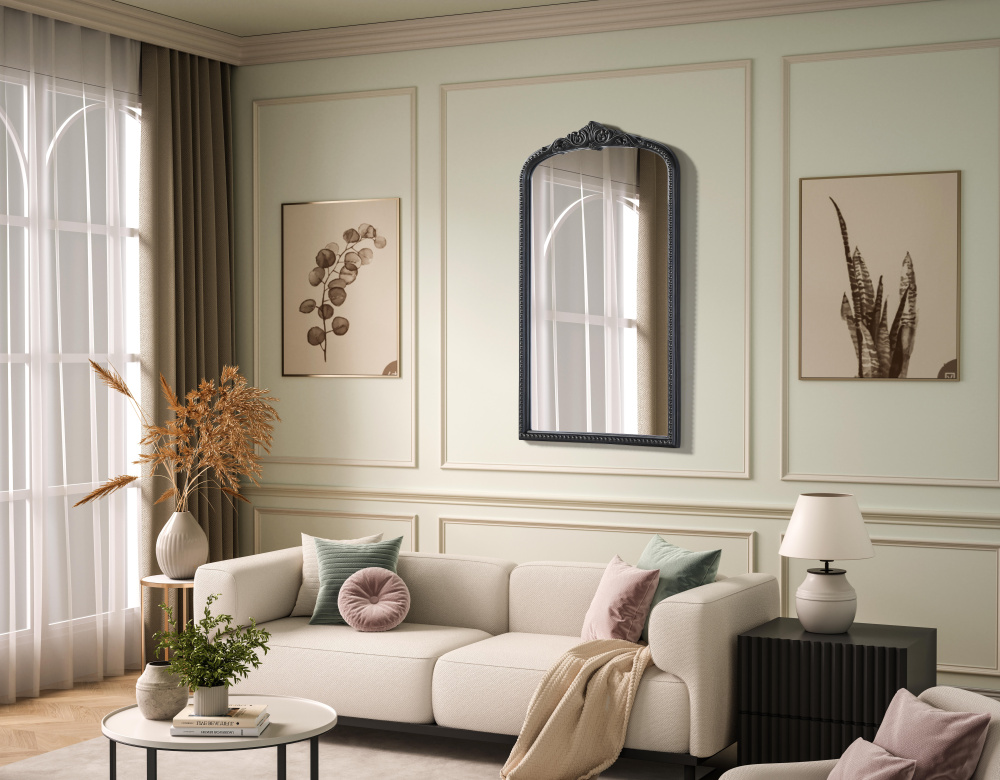 The mirror features a softly curved arch at the top, adding a refined and timeless touch to any space.