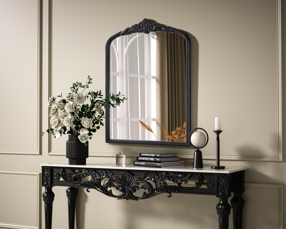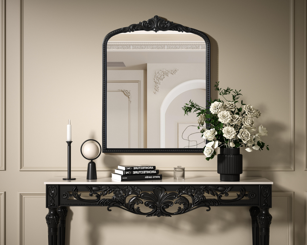 Bring classic charm and vintage character to your home with this arched wall mirror in a distressed vintage bronze finish. The hand-painted frame showcases ornate scroll and floral detailing, creating a refined, old-world aesthetic. Crafted from resin with an MDF backing board, this mirror is lightweight yet durable. Designed for vertical hanging only, it includes two metal inset hangers for easy installation (hardware not included). Whether placed above a fireplace mantel, in an entryway, or as an accent piece in a living room, this mirror enhances the space with its architectural beauty. Available in multiple sizes and an alternative antique brass finish, it is a versatile addition to classic, vintage, or French-inspired interiors.