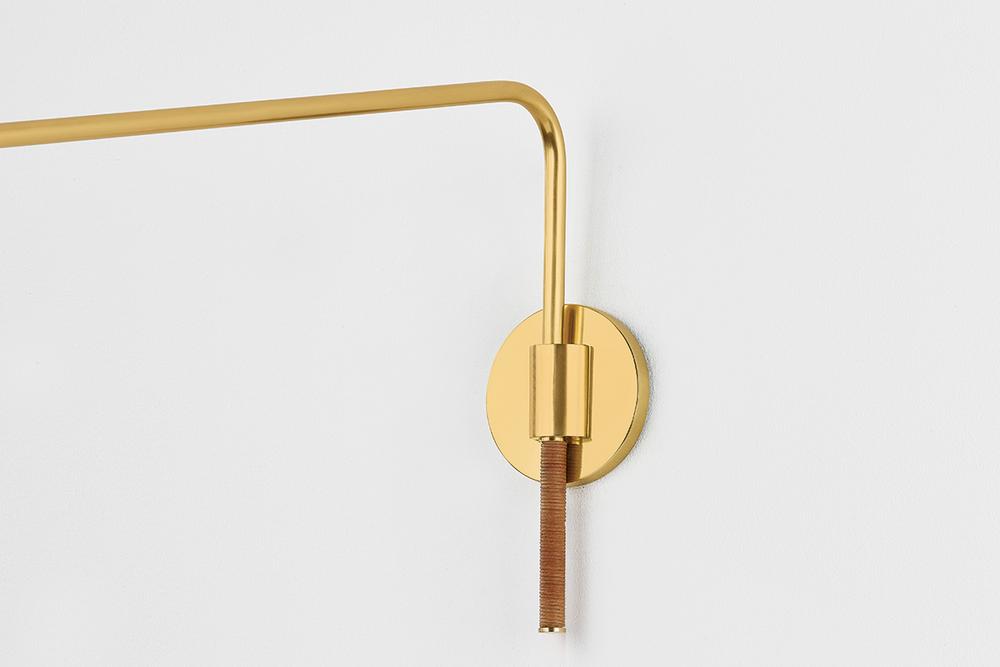 The Narragansett family tells an innovative design story marked by the use of tactile materials. While the silhouette of this sconce and floor lamp are understated, the Aged Brass metalwork and rattan-wrapped details mix hard and soft, manmade and natural. The elongated swing arm feature makes Narragansett perfect for bedside, desk, or reading nook illumination. Due to the one-of-a-kind nature of the medium, exact colors and patterns may vary slightly from the image shown.