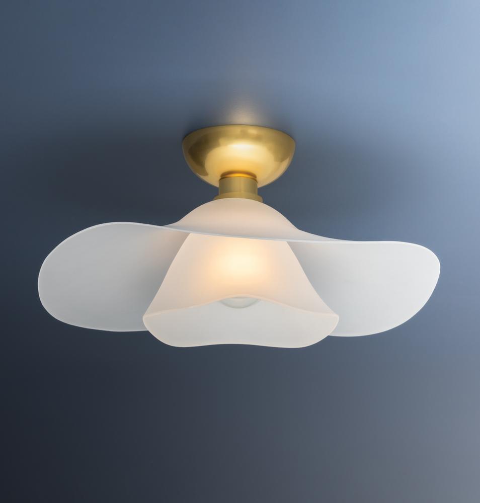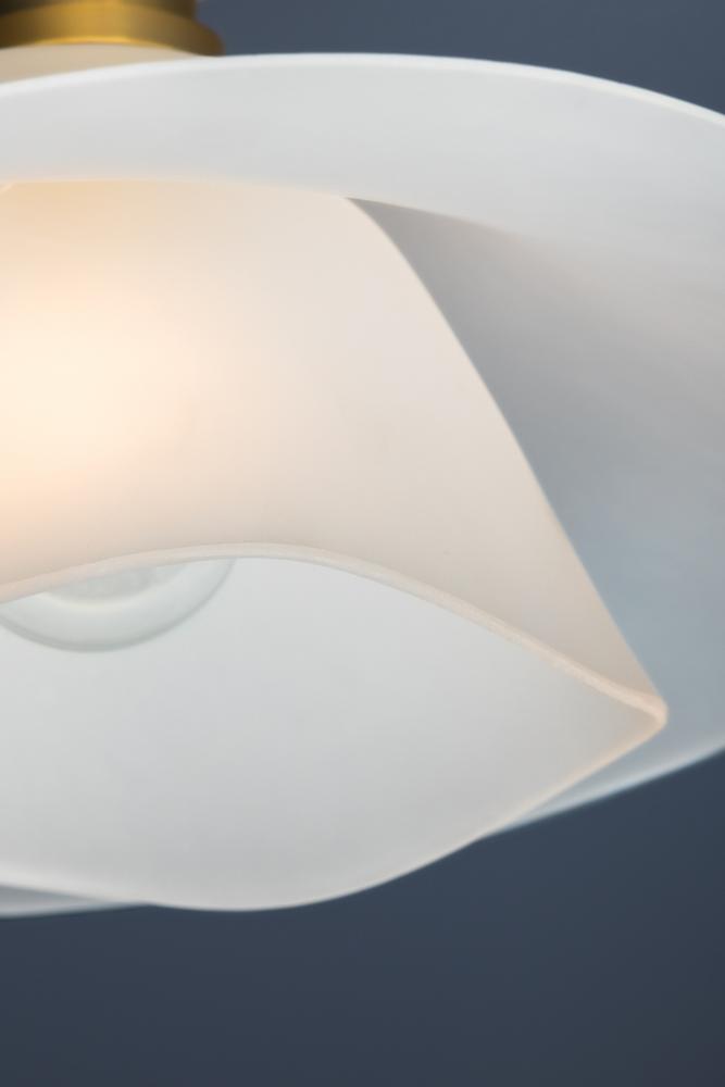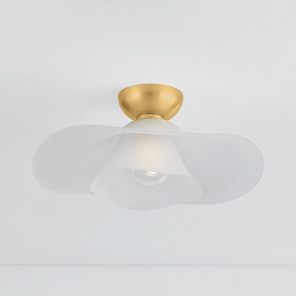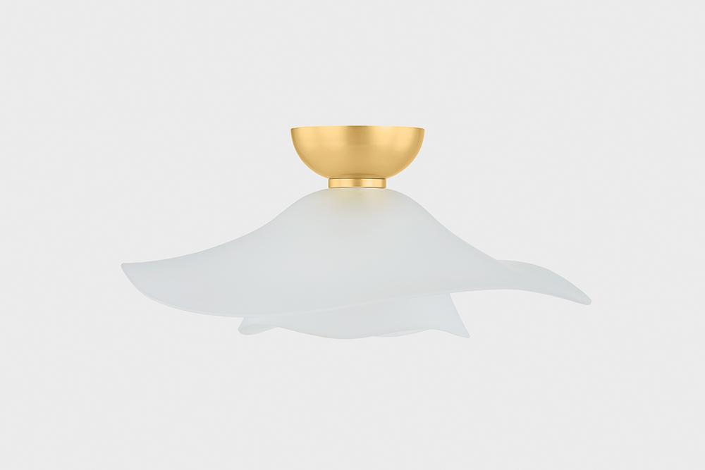 Two shallow, undulating glass shades are nested together to create the dynamic, flowing silhouette of Netherlee. This ethereal flush mount is inspired by a flower in bloom, bringing an organic, artistic touch to living and dining spaces. The Aged Brass ceiling canopy complements the airiness of the shade with a luxe quality.