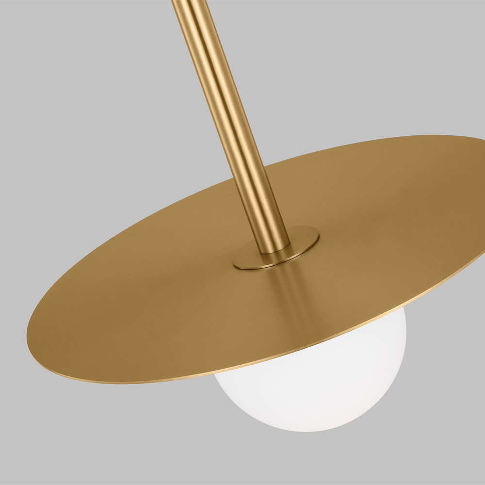 The Nodes one light indoor pendant in burnished brass provides abundant light to your home, while adding style and interest. Nodes task, ceiling and wall lighting is minimal yet bold, highlighting Kelly's distinctive juxtaposition of mixed-materiality and curvilinear form. Light radiates from milk glass globes set against metal discs. All fixtures can be used or without the discs. The cast canopy is available in Burnished Brass or Midnight Black. Hanging fixtures within this family feature black fabric cords, while pivot sconces can be cord and plug or hard wire.