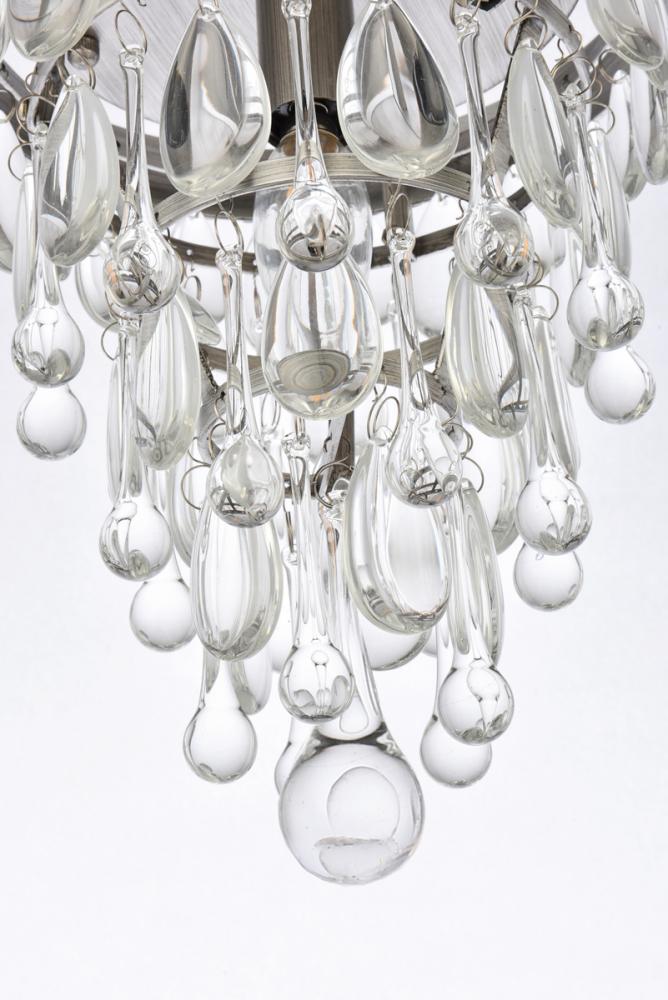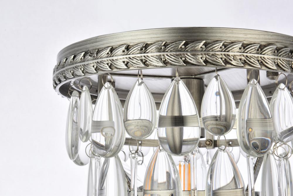 Like icicles reflecting the winter sun, Nordic flush-mount fixtures glisten with royal-cut clear crystal drops illuminated by the soft glow of the candelabra bulb inside. An etched frame base of antique silver bands the descending tiers of icy crystals.