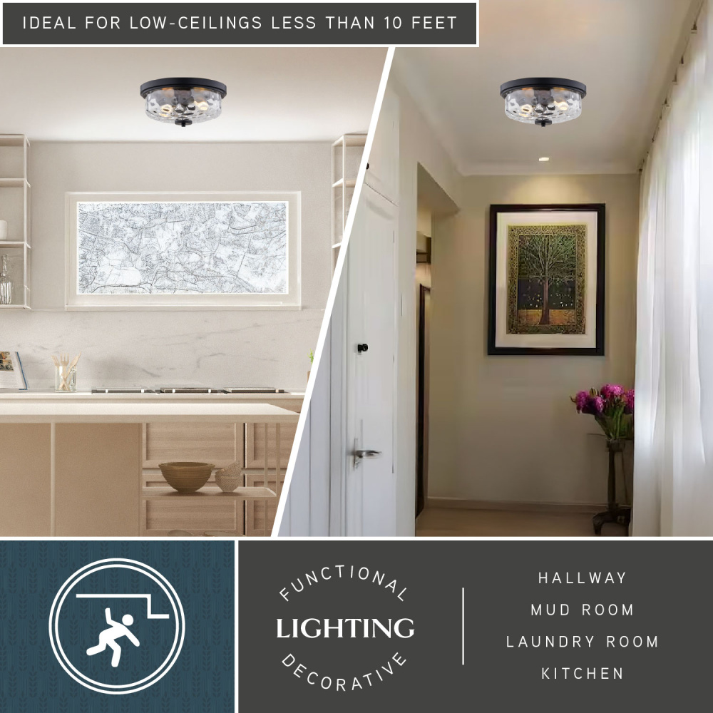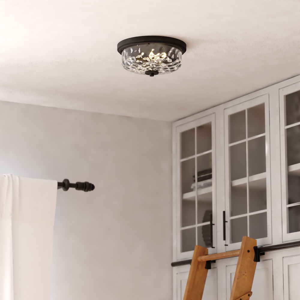 Bring modern elegance to your space with the Northlake 2-light flush mount. Featuring a sleek matte black finish paired with clear water glass, this ceiling light fixture strikes the perfect balance between contemporary design and timeless style. Ideal for transitional spaces, its versatile design works effortlessly in living rooms, hallways, and bedrooms, providing a warm, ambient glow. With room for two 60W bulbs (sold separately), this fixture offers just the right amount of light while adding a touch of sophistication to any room.