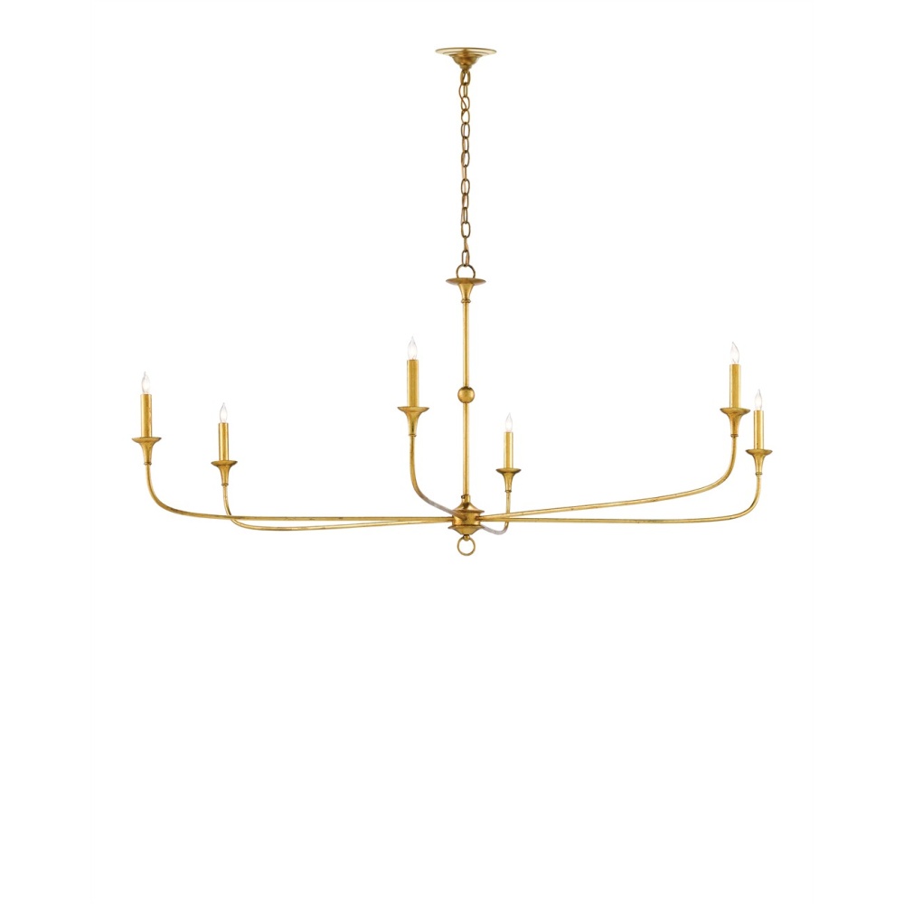 Long arms stretch gracefully from a small cog, which is ornamented with a ring, that rests at the bottom of the stem of the Nottaway Gold Chandelier. Though it is a seriously minimalist fixture, the profile of the six-light chandelier has a lovely fluidity to it that makes it a natural choice for traditional and transitional interiors. The contemporary gold leaf finish to which the Nottaway has been treated adds textural interest to the chandelier. We offer the Nottaway in a smaller version in gold and in two sizes in a bronze finish.