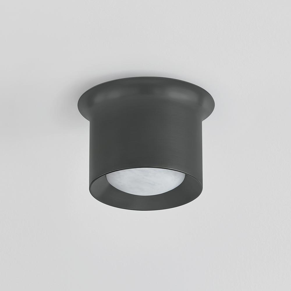A sleek flush mount with unadorned metalwork, Noxon celebrates the beauty of simplicity. Situated within the metal frame, the matte cloud glass shade washes light around the reflector. with a gentle swell at the canopy, the frame creates the effect of flowing into the ceiling. Noxon is available in a classic Aged Brass or more industrial Distressed Bronze finish.