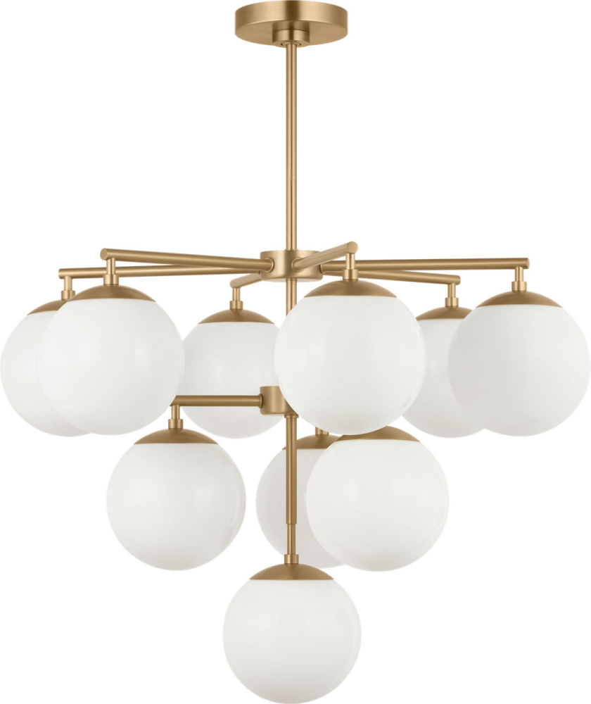 The Nube 10?Light Chandelier features ten layered milk glass globes that hover below a central hub and radial arms. Its balanced arrangement and open silhouette create an elegant focal point in large spaces such as grand living rooms or entryways. The chandelier delivers ambient, diffused light without heavy structure, allowing the glass forms to take visual precedence.