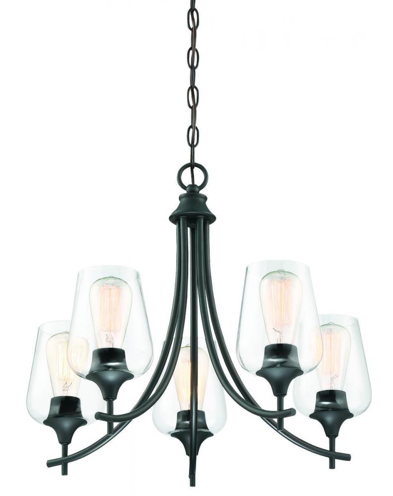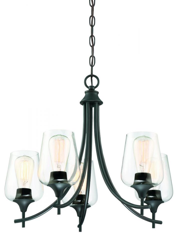 This 5-light chandelier from the Savoy House Octave collection has understated elegance. It features large curved shades of clear glass, minimal detailing and a bold English bronze finish. Chandeliers can be used in a wide variety of spaces, including but certainly not limited to dining rooms, living rooms, great rooms, bedrooms, kitchens, foyers, offices, closets and even bathrooms! Because this chandelier is chain-hung, you can use as much or as little chain as you need to fit your specific hanging height needs, and it can be used on a sloped ceiling. Since the bulbs are exposed, try using stylized bulbs (not included) like Edison style for a different twist! The English bronze finish can be paired with bronze hardware or mixed with hardware in other finishes. Try the Octave with glam, transitional or contemporary style rooms for a chic look. When you choose a Savoy House lighting fixture, you can be certain you've selected a piece that will withstand the test of time.