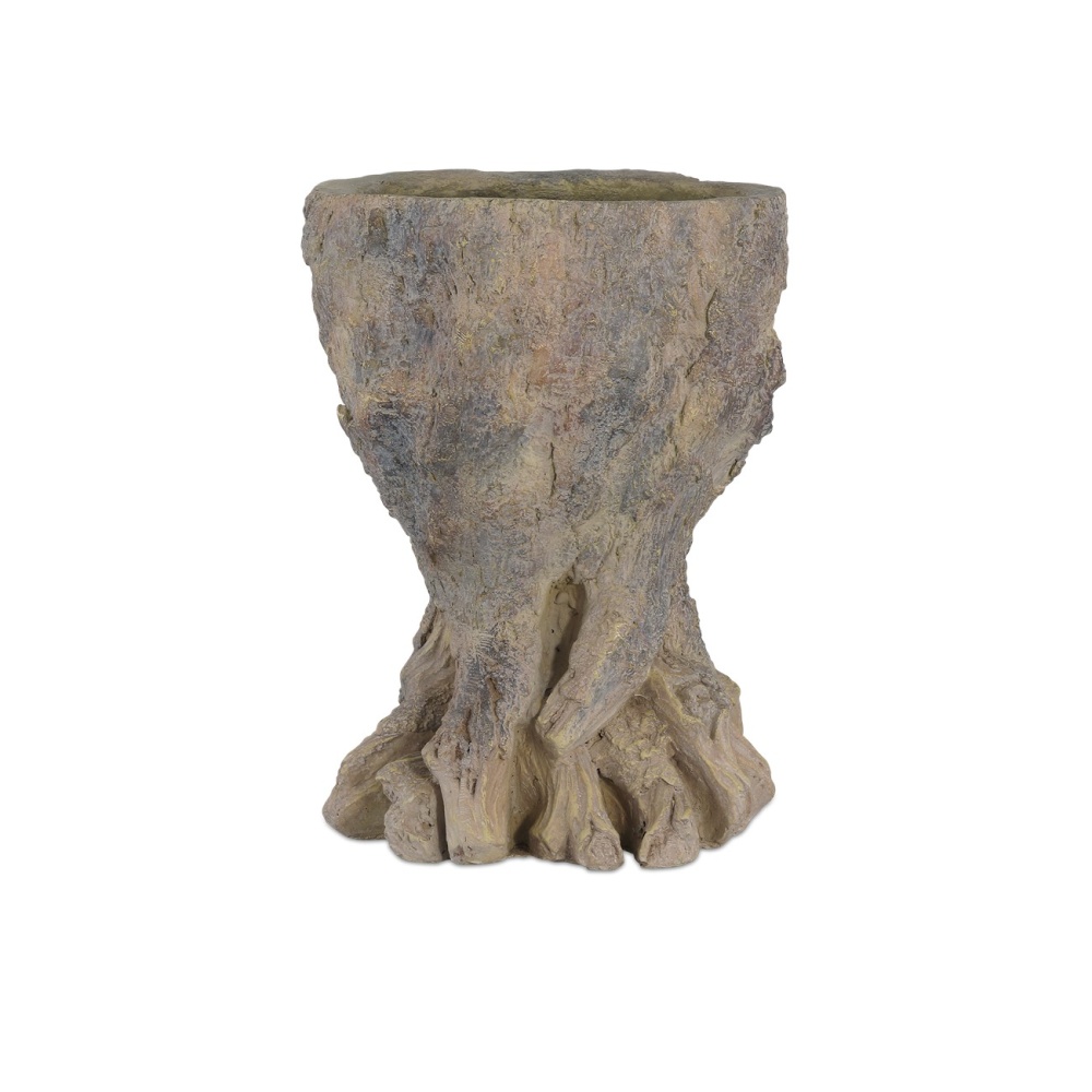 In the tradition of faux bois, the Old Growth Small Planter is incredibly lifelike. Crafted from fiber cement in a dappled finish, the stump-shaped brown planter looks aged like an antique would had it been ornamenting a garden for decades. The way the gnarled roots culminate at the bottom is particularly convincing. This plant pot has a drain hole.