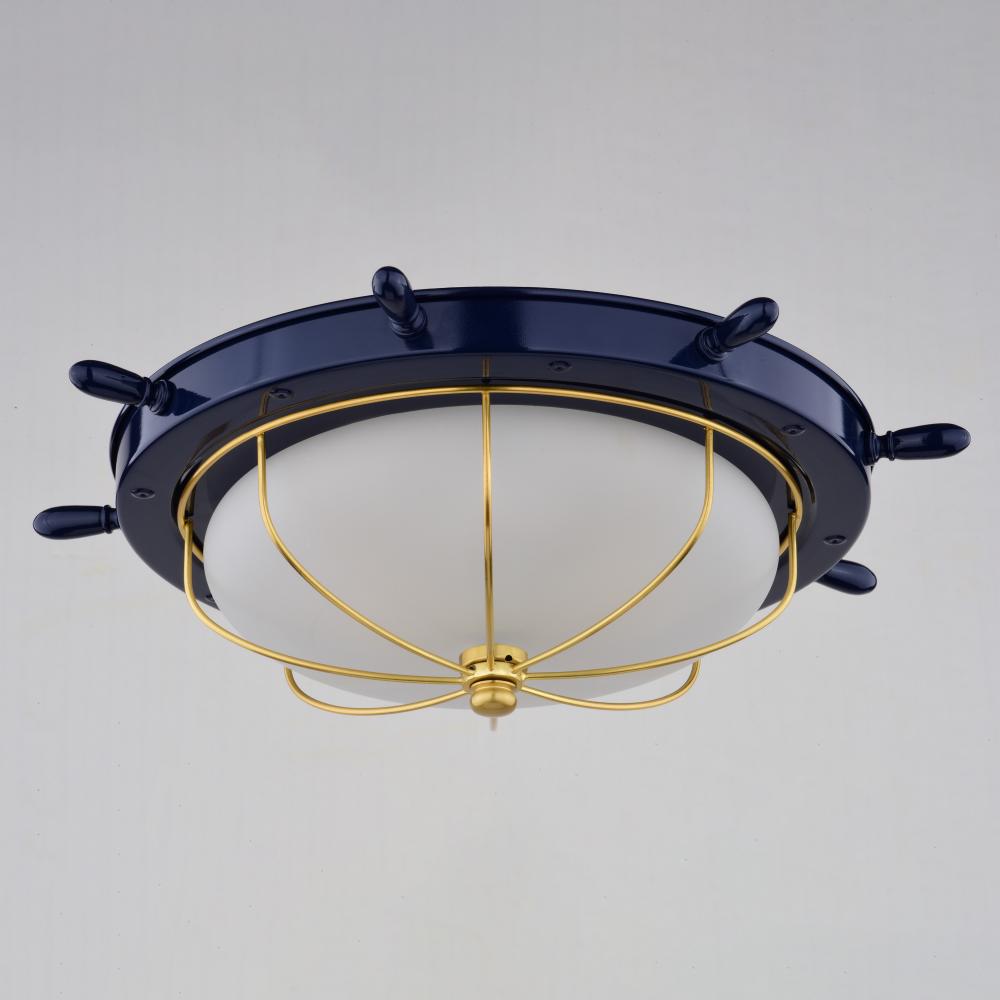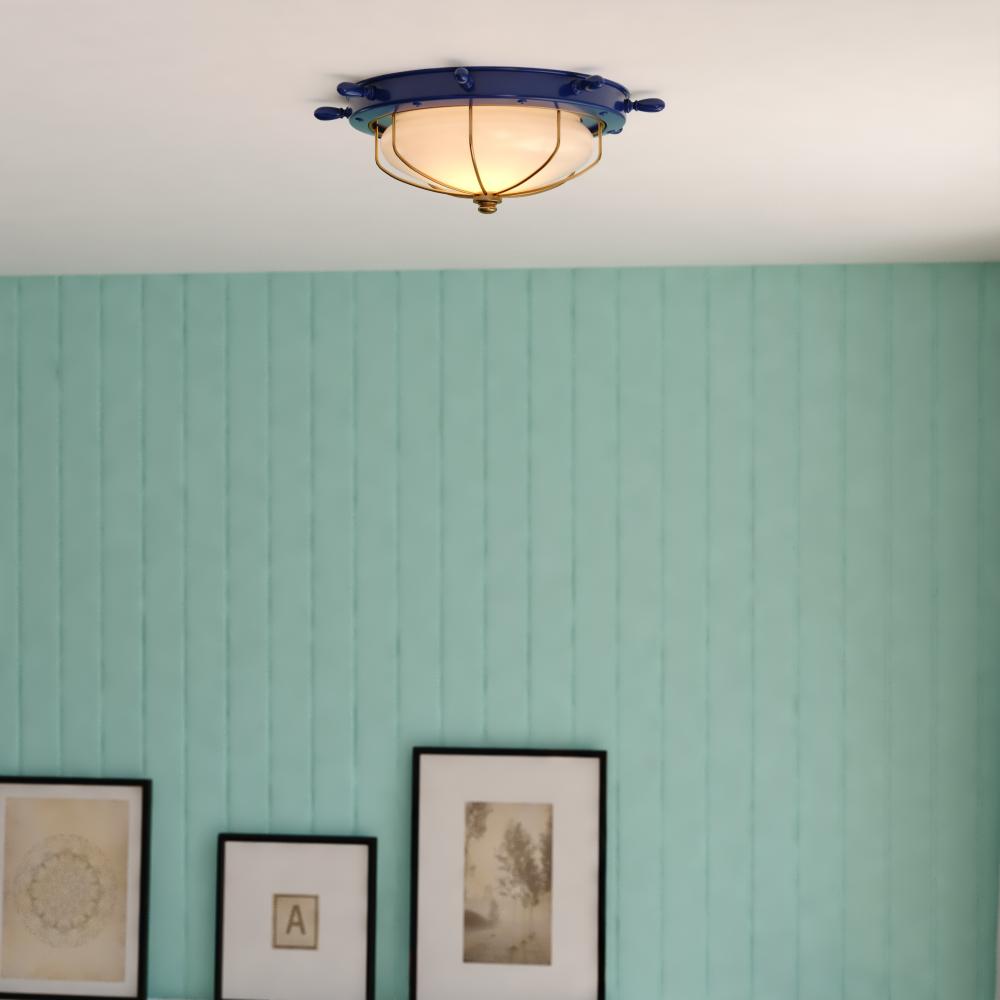 The Orleans updates a classic nautical ships wheel design and makes it even better. The Orleans features a navy blue and matte gold finish with frosted glass. This versatile flush mount can be used indoors as well as outdoors. Mount these lights on your porch, entryway, or inside your home and experience this coastal look for yourself.