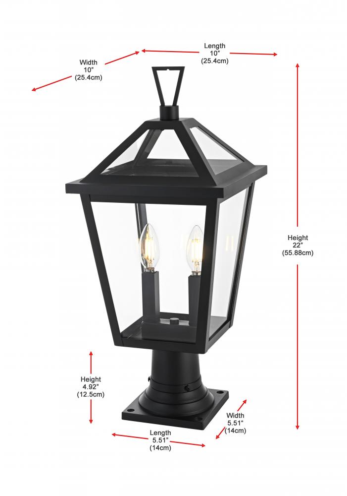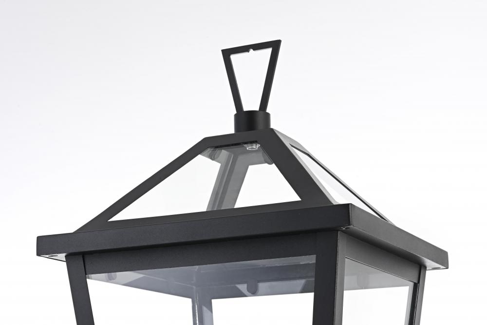 This outdoor post light is a beautiful embodiment of modern and classic design that perfectly complements any exterior home setting. Constructed from sturdy iron and clear glass, the light combines sharp architectural lines with a timeless lantern style, resulting in a statement fixture that enhances curb appeal. The angular matte black frame, topped by a stylish triangular loop, embraces an open, trapezoid-shaped structure with clear glass panels that reveal two E12 candelabra sockets. These sockets provide the ideal opportunity to incorporate flame-shaped bulbs for a warm, welcoming ambiance. Its classic look ensures versatility, making it a perfect addition to walkways, gardens, or patio posts, adding light where needed.