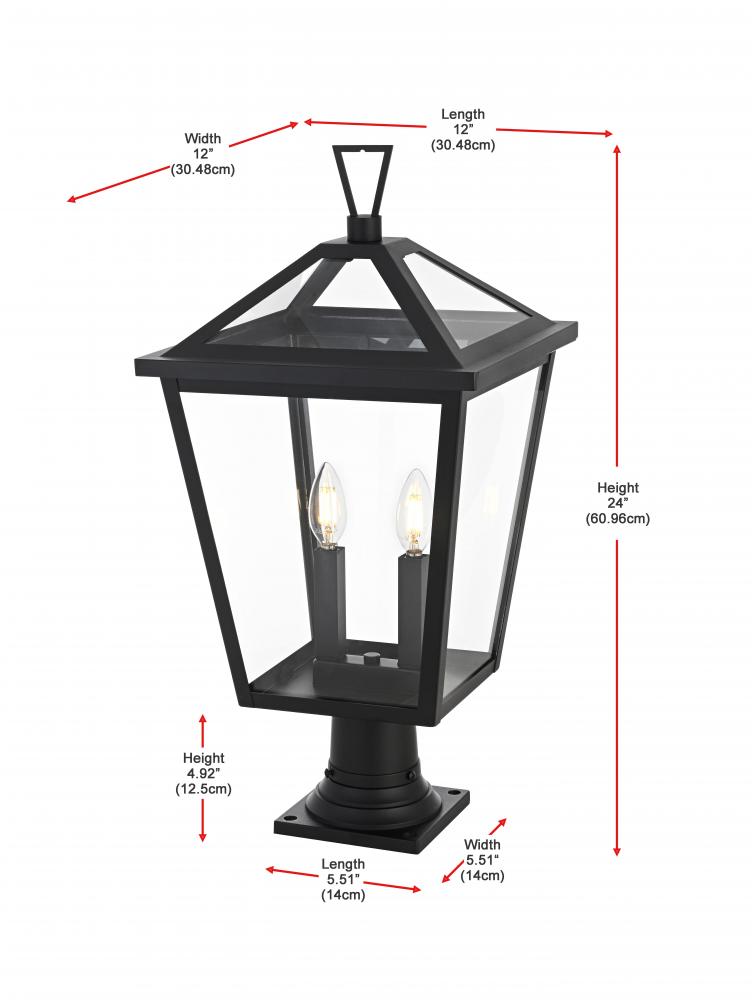 This outdoor post light is a beautiful embodiment of modern and classic design that perfectly complements any exterior home setting. Constructed from sturdy iron and clear glass, the light combines sharp architectural lines with a timeless lantern style, resulting in a statement fixture that enhances curb appeal. The angular matte black frame, topped by a stylish triangular loop, embraces an open, trapezoid-shaped structure with clear glass panels that reveal two E12 candelabra sockets. These sockets provide the ideal opportunity to incorporate flame-shaped bulbs for a warm, welcoming ambiance. Its classic look ensures versatility, making it a perfect addition to walkways, gardens, or patio posts, adding light where needed.
