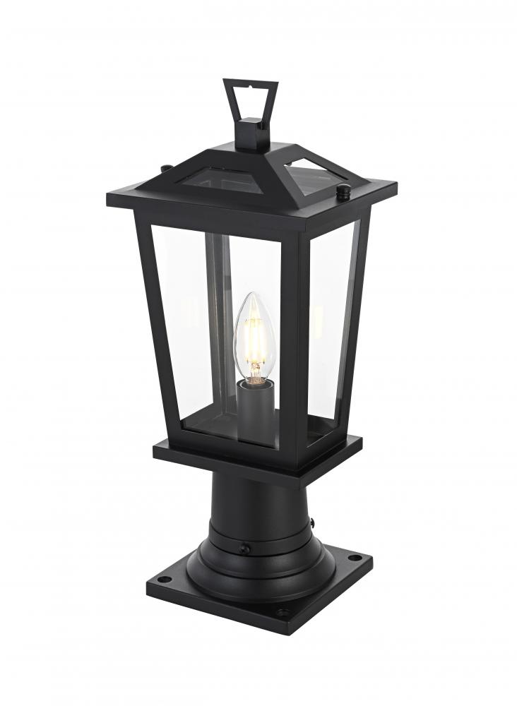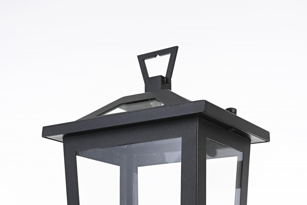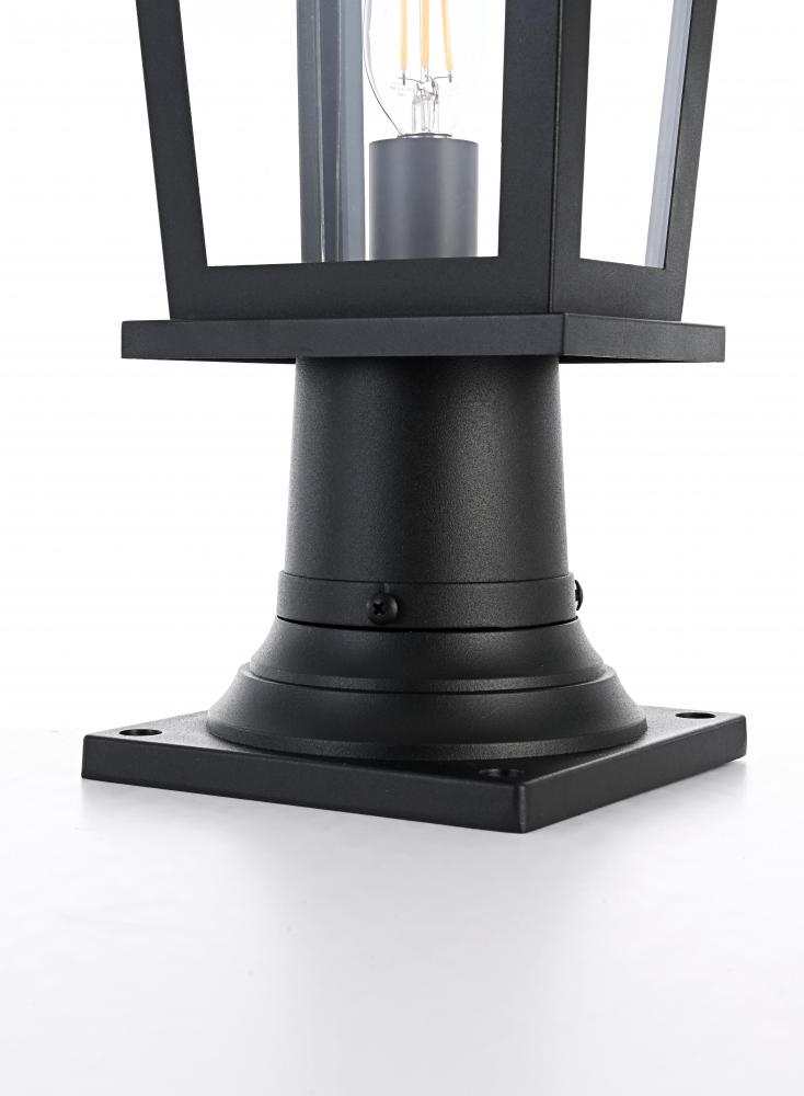 Enhance your outdoor space with this stylish post light that features a striking matte black frame paired with clear glass panels, perfectly showcasing its modern charm. The latern box shape is adorned with a distinctive triangular loop on top, adding a unique architectural touch that seamlessly combines functionality with a bold, sleek aesthetic. The open bottom design allows for easy bulb changes and casts a beautiful downward light, adding a welcoming glow to your entrance or patio area. Crafted from durable iron with a clean, modern style, this post light is perfect for those who appreciate a blend of simplicity and contemporary design. The clear glass ensures maximum light output, enhancing visibility while emphasizing the beautiful shape of the bulb inside. The E12 socket offers versatility for different bulb styles, allowing you to easily customize the ambiance of your outdoor area.