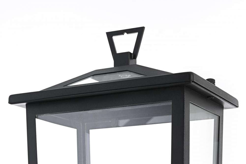 Enhance your outdoor space with this stylish post light that features a striking matte black frame paired with clear glass panels, perfectly showcasing its modern charm. The latern box shape is adorned with a distinctive triangular loop on top, adding a unique architectural touch that seamlessly combines functionality with a bold, sleek aesthetic. The open bottom design allows for easy bulb changes and casts a beautiful downward light, adding a welcoming glow to your entrance or patio area. Crafted from durable iron with a clean, modern style, this post light is perfect for those who appreciate a blend of simplicity and contemporary design. The clear glass ensures maximum light output, enhancing visibility while emphasizing the beautiful shape of the bulb inside. The E12 socket offers versatility for different bulb styles, allowing you to easily customize the ambiance of your outdoor area.