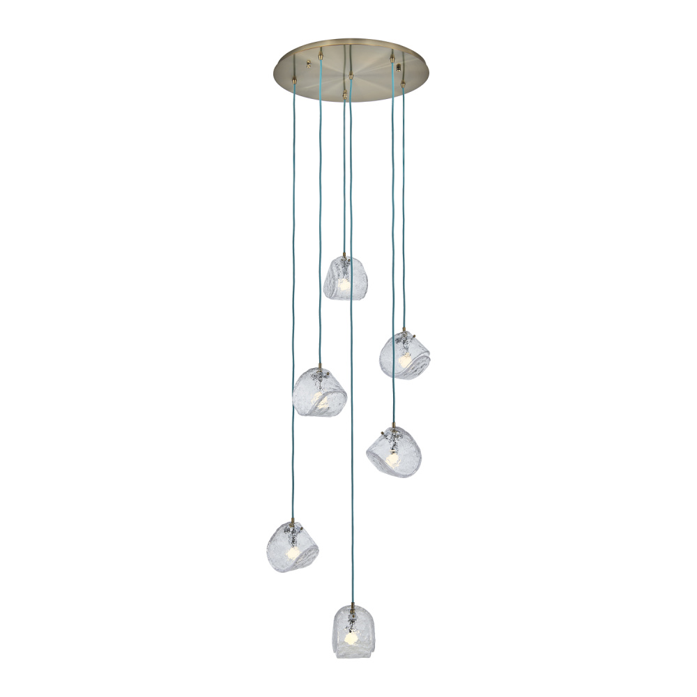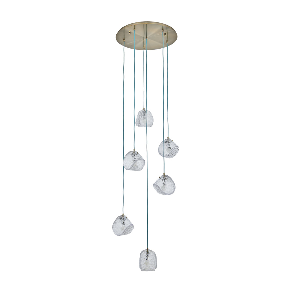 This versatile and contemporary family features a variety of multi drop arrangements and color options to add a designer touch to any space. Inspired by the construction and pattern of the tennis ball, this unique, textured glass comes in clear or smoke, and is paired with a coordinating colored power cord and a Winter Brass (WB) or Satin Black Nickel (SBN) finish.