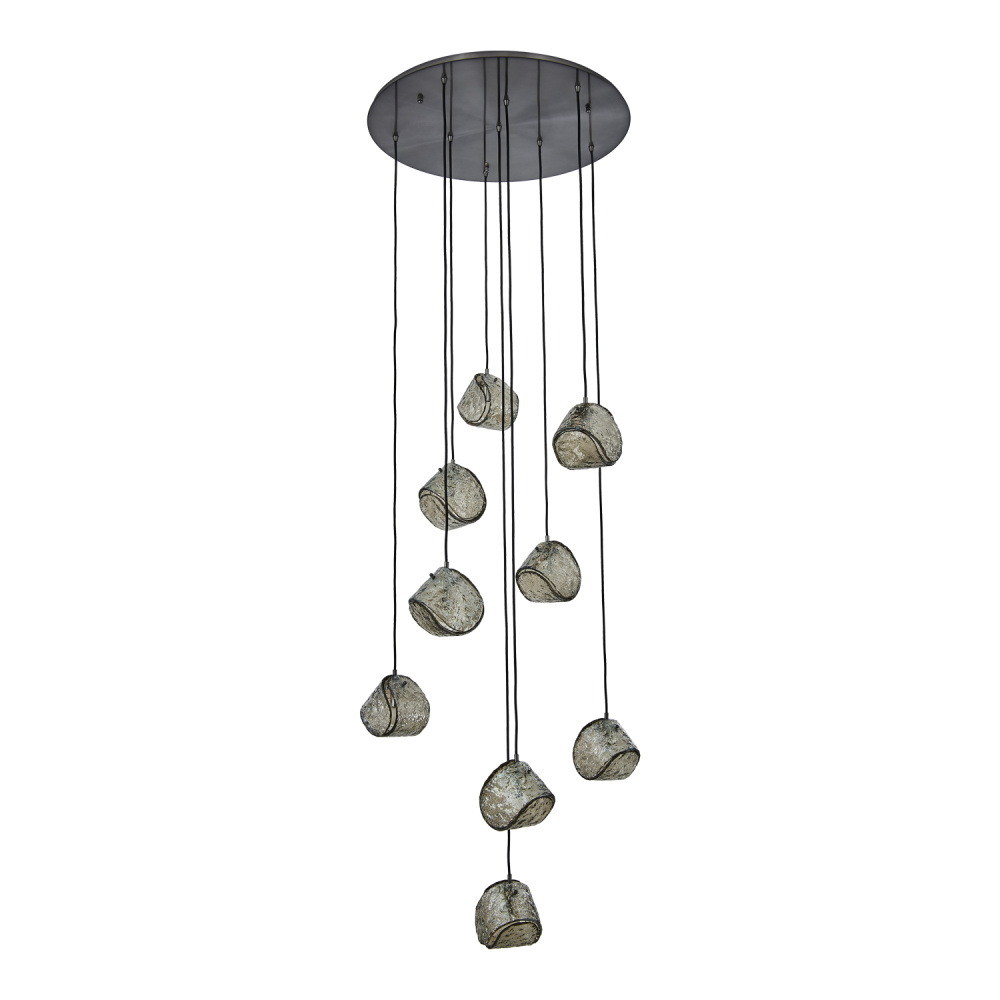 This versatile and contemporary family features a variety of multi drop arrangements and color options to add a designer touch to any space. Inspired by the construction and pattern of the tennis ball, this unique, textured glass comes in clear or smoke, and is paired with a coordinating colored power cord and a Winter Brass (WB) or Satin Black Nickel (SBN) finish.