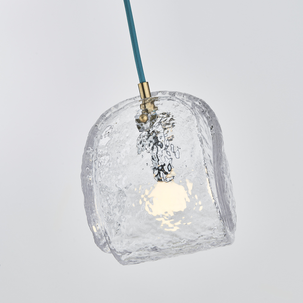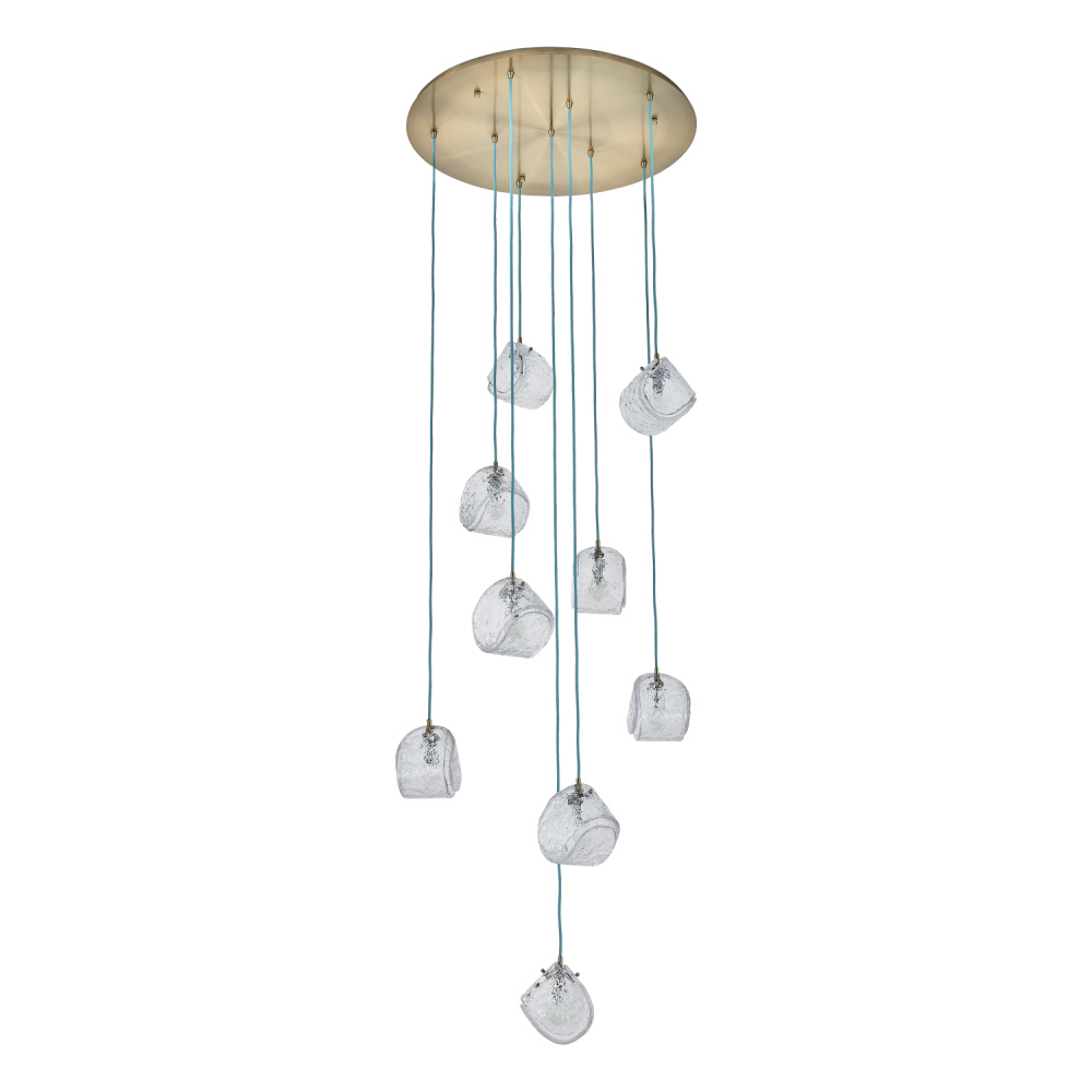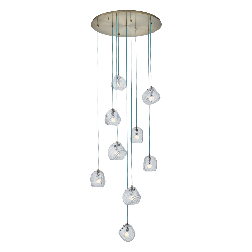 This versatile and contemporary family features a variety of multi drop arrangements and color options to add a designer touch to any space. Inspired by the construction and pattern of the tennis ball, this unique, textured glass comes in clear or smoke, and is paired with a coordinating colored power cord and a Winter Brass (WB) or Satin Black Nickel (SBN) finish.