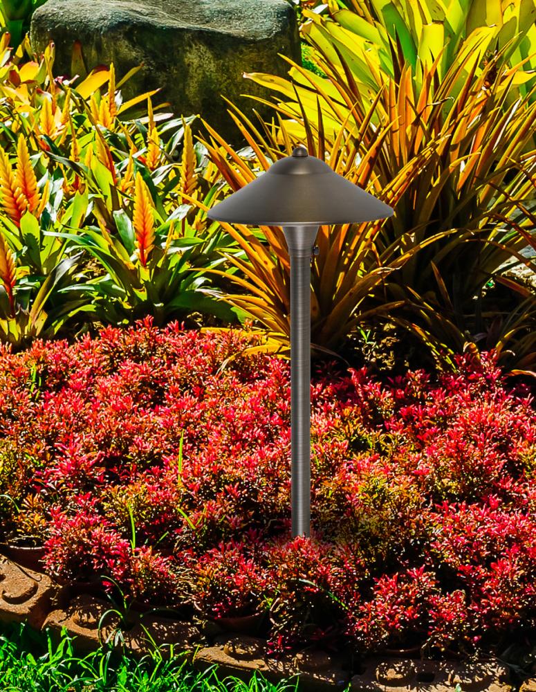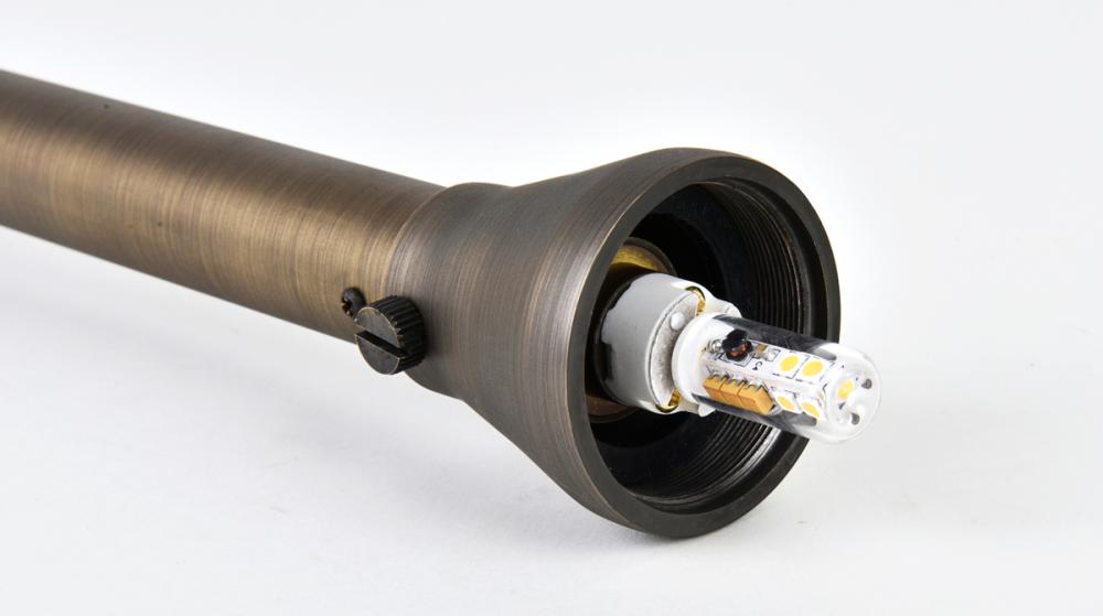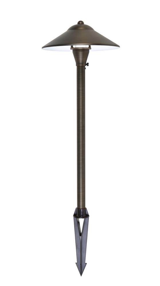 Inspired by the species of brightly-colored mushrooms, Chanterelle path lights create the perfect mood lighting for your evening stroll. The spinning brass frame in an antique-brass finish features an eight-inch spike for stability. with matching brass shade, the entire fixture stands 24 inches tall and requires a 20-watt G4 halogen bulb (not included). Ideal for brightening a dark driveway, front entrance, or a garden path.