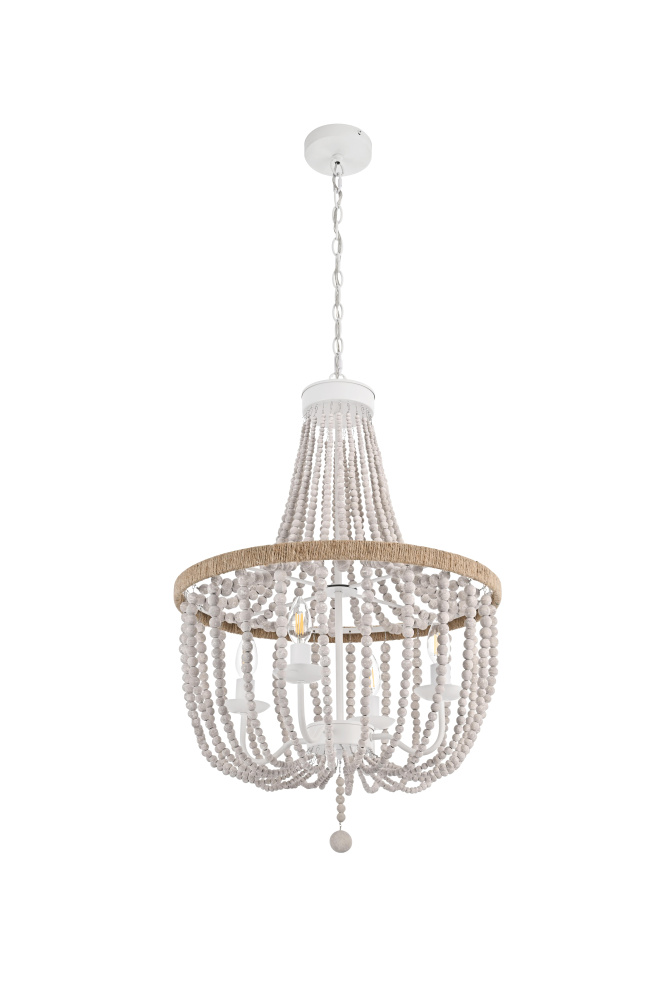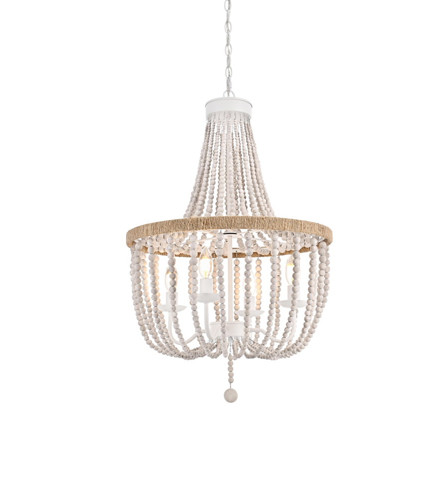 Elevate your space with this masterfully crafted pendant that artfully blends rustic charm with refined elegance. The dramatic cascading strands of wooden beads create a mesmerizing display of light and shadow, while the rope-wrapped crown adds an authentic touch of artisanal craftsmanship. Each piece showcases the natural beauty of carefully selected wooden beads, arranged in graceful loops that draw the eye upward and create a sense of gentle movement. The substantial iron framework ensures stability while maintaining an airy, elegant presence. Perfect for dining rooms, entryways, or living spaces, this versatile fixture adapts beautifully to various ceiling heights through its adjustable chain system. The three-light design provides ample illumination while creating enchanting patterns through the beaded strands. Whether styled in sophisticated antique white or warm natural beige, this pendant makes a striking statement while maintaining an organic, approachable presence. The thoughtful blend of materials and textures creates a piece that feels both timeless and fresh, making it an ideal choice for designers and homeowners seeking to create a space with both character and refinement.