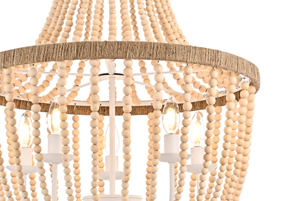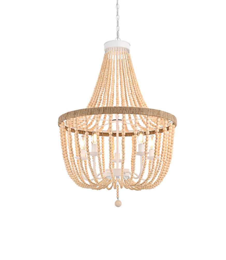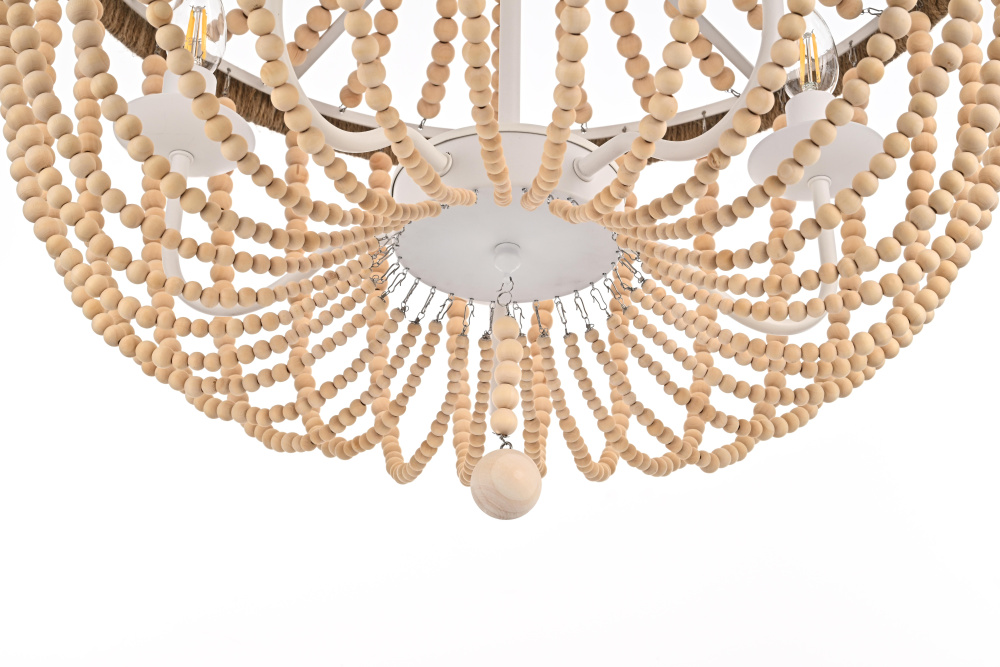 Elevate your space with this masterfully crafted pendant that artfully blends rustic charm with refined elegance. The dramatic cascading strands of wooden beads create a mesmerizing display of light and shadow, while the rope-wrapped crown adds an authentic touch of artisanal craftsmanship. Each piece showcases the natural beauty of carefully selected wooden beads, arranged in graceful loops that draw the eye upward and create a sense of gentle movement. The substantial iron framework ensures stability while maintaining an airy, elegant presence. Perfect for dining rooms, entryways, or living spaces, this versatile fixture adapts beautifully to various ceiling heights through its adjustable chain system. The three-light design provides ample illumination while creating enchanting patterns through the beaded strands. Whether styled in sophisticated antique white or warm natural beige, this pendant makes a striking statement while maintaining an organic, approachable presence. The thoughtful blend of materials and textures creates a piece that feels both timeless and fresh, making it an ideal choice for designers and homeowners seeking to create a space with both character and refinement.