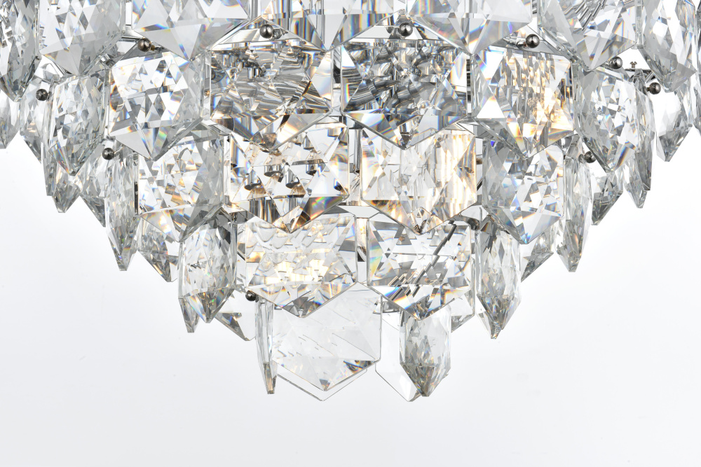 Adorned with six-sided, precision-cut crystals, each tier cascades down to create a radiant play of light and dimension.