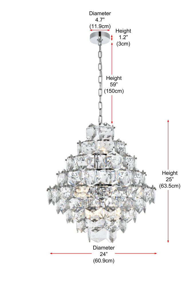 Transform your space with this cascading multi-tier pendant light that combines striking design with meticulous craftsmanship. Crafted from a sturdy iron frame and adorned with six-sided faceted crystals, this lighting piece exudes charm through its ability to diffuse light into a soft, radiant glow. With finishes available in both sleek chrome for a contemporary feel and satin gold for a warmer, refined touch, it complements a range of decor styles. The adjustable height, from 34 inches to 94 inches with the included 59-inch chain, ensures it fits seamlessly in any setting. Equipped with fifteen E12 sockets and dimmable functionality, you can customize the lighting to suit your mood or occasion. Its matching canopy and chain finish complete the cohesive design, making it perfect for kitchens, dining rooms, living rooms, or offices. A statement piece that transforms your space into a work of art, this pendant is the perfect blend of style and functionality.