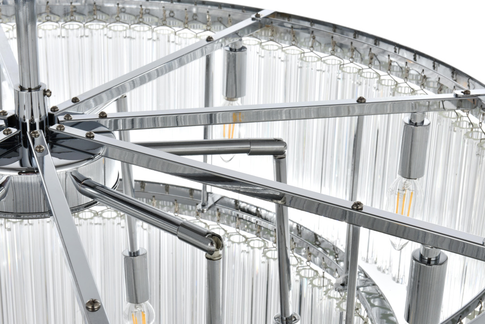Turn your space into a glowing masterpiece with this striking pendant light, crafted from durable iron and shimmering clear ribbed glass. The cascading layers create a stunning interplay of light and shadow, refracting illumination into a radiant display that transforms your space into an illuminated work of art. Available in chrome for a sleek, contemporary aesthetic, black for bold contrast, and satin gold for an inviting warmth, this pendant light is as versatile as it is beautiful. Whether you choose a single tier for minimalist charm, two tiers for balanced depth, three tiers for bold presence, or four tiers for show-stopping grandeur, there’s an option for every setting. Featuring both round and rectangular frame designs, this fixture adapts to any space with ease. Complete with a matching canopy and chain, and fully dimmable for customized lighting, this pendant pairs perfectly with the coordinating single-tier flush mount and wall sconce collection, ensuring a cohesive, radiant design throughout youhome or office. Please note: light bulbs are sold separately.