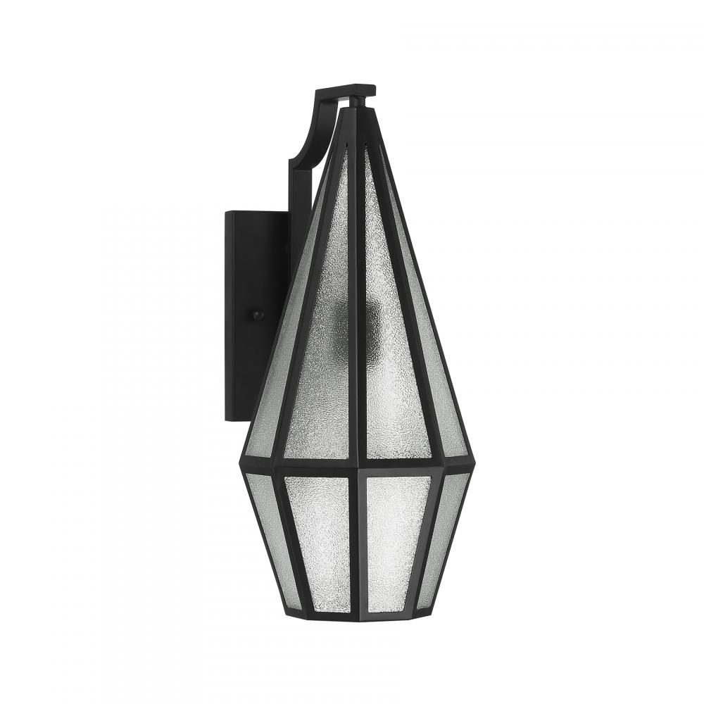 Decorate your great outdoors with the highly glamorous Savoy House Peninsula 1-light outdoor wall lantern. Its tall, slim, diamond-like design showcases panes of art glass that obscure the light within and create lots of eye-catching texture. Matte Black finish. Peninsula is 18" in height, 7.5" in width and extends 10.5" from the wall. Uses one standard size bulb of up to 60 watts. The bulb is not included. Wet area rated.