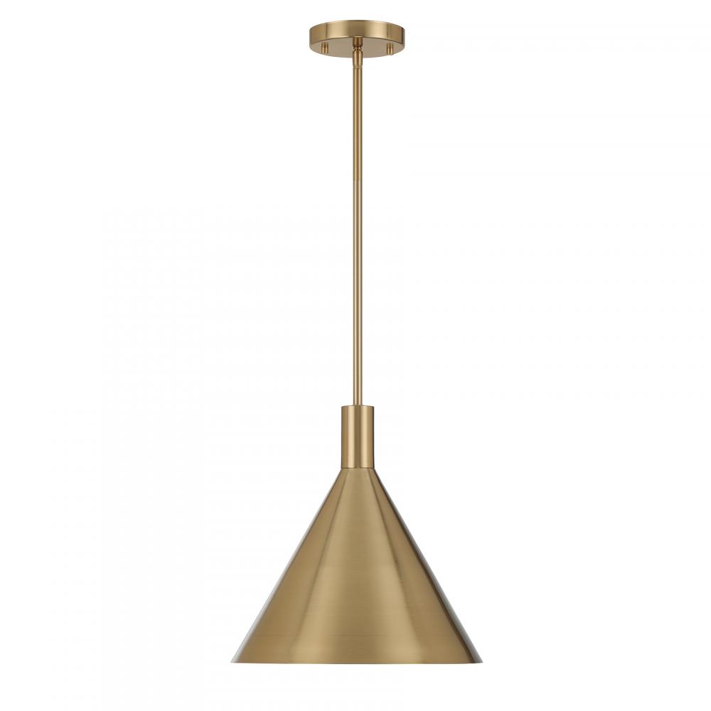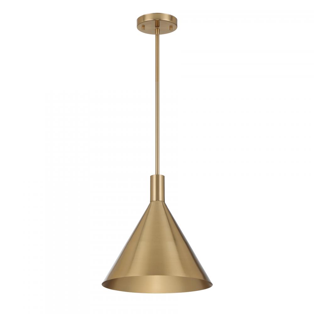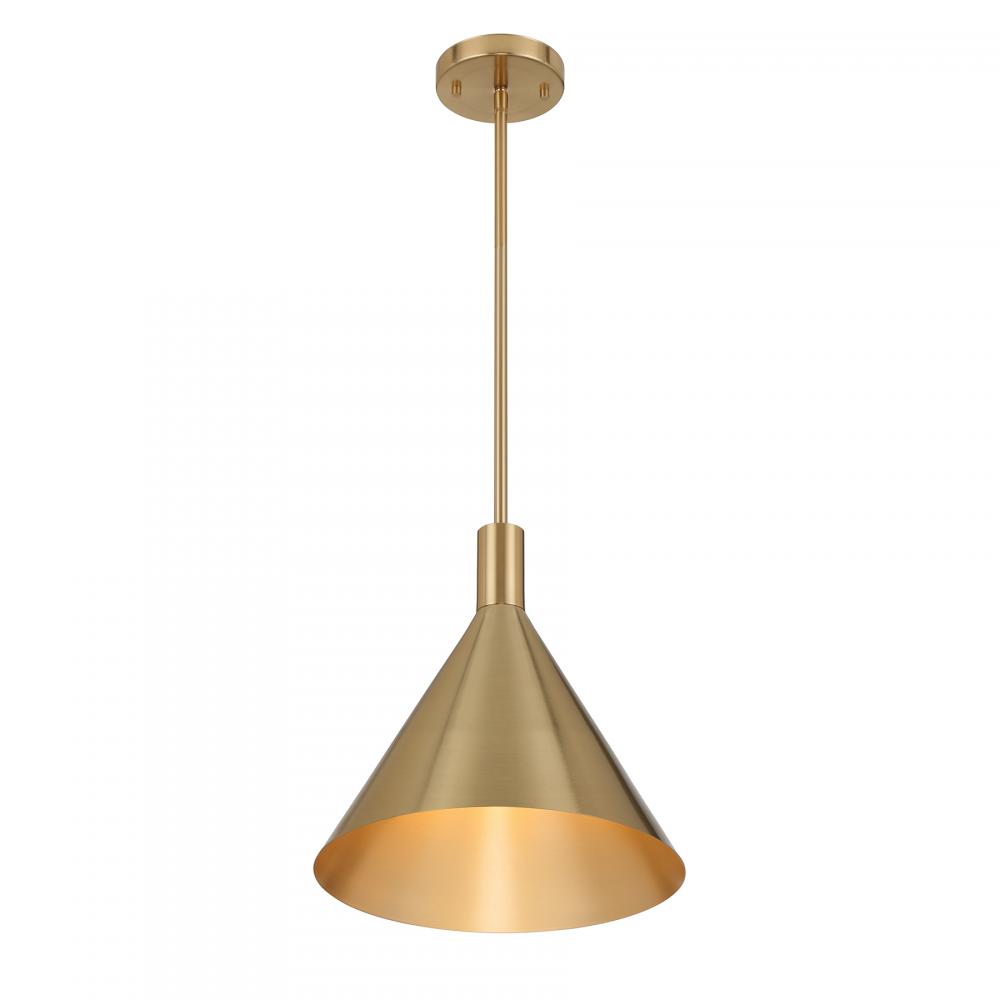 The Savoy House Pharos 1-light pendant is part of Moderne by Breegan Jane, bringing her signature approachable modern luxury style to your home. Breegan loves how metallics elevate a design, as exemplified by this opaque metal shade finished entirely in champagne-toned Noble Brass. Try using a grouping of Pharos pendants to really turn up the style. Pharos is 13" in width and has an adjustable height ranging from 13.25" to 67.25". Comes with four 12" downrods and one 6" downrod. Uses one standard size bulb of up to 60 watts. The bulb is not included.