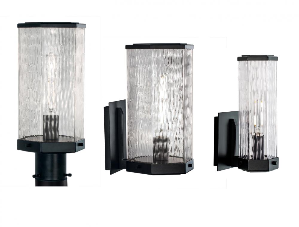 Unique outdoor fixture with six sided, wavy glass, with matte black finish