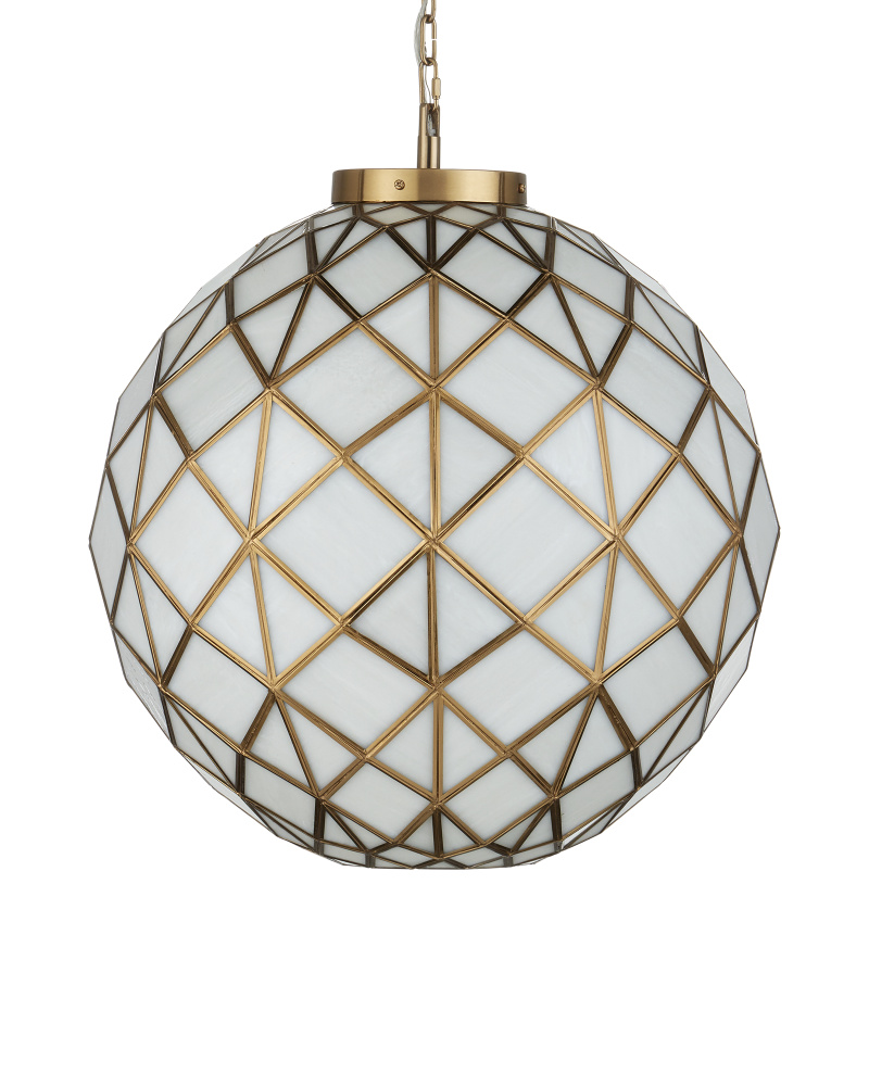 The name of he Polyhedron Medium Pendant pays homage to its triangular panes of white glass pieced together between antique brass delineations. Though the glass looks uniform when the illumination warms it, there are subtle drifts of milkier white in some spots that others, which adds a bit of texture to this geometric design. Adjustable from 29.5" to 97.5" with use of included chain/rod kit/cable. If your space calls for a longer drop, additional chain/rods/cable is available for purchase.