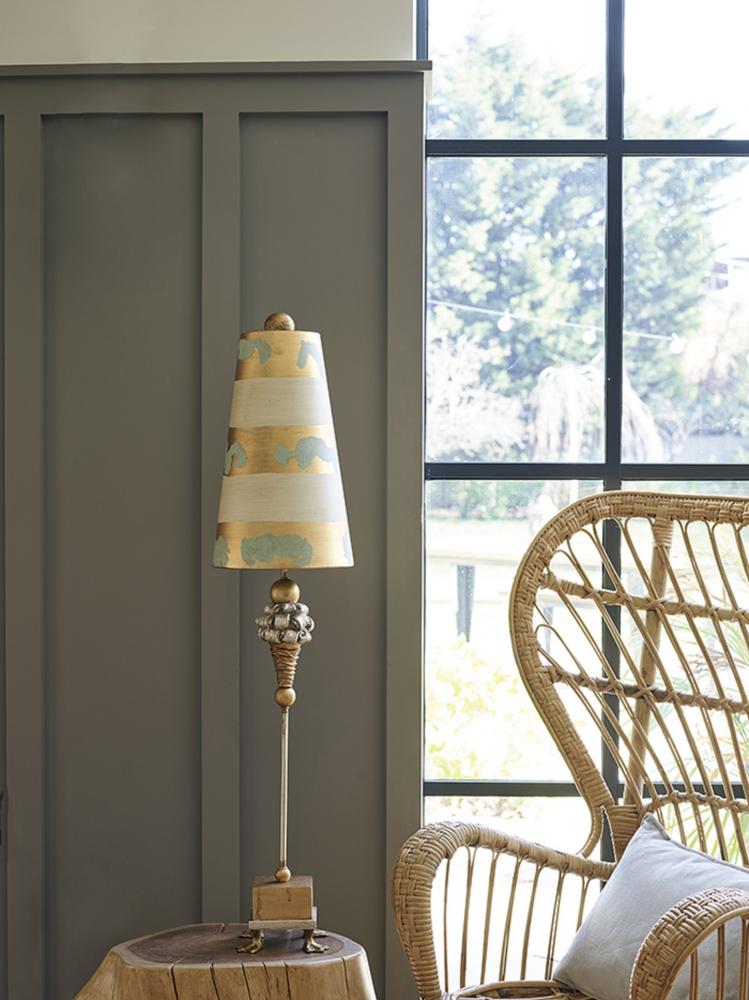 This 40" Pompadour Luxe Buffet Lamp by Lucas McKearn features a gold striped shade and duck feet in a New Orleans style. Its neutral glam adds sophistication to any space with classic charm.