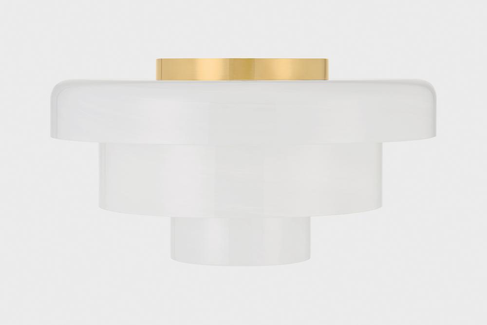 Inspired by an iconic mid-century design, this layered flush mount makes a bold style statement. Three concentric clear cloud glass shades surround a central light bulb, reducing glare. The varied heights of the glass allow the light to glow outwards from all points of the fixture.