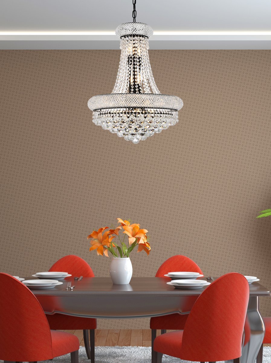 The primo series of hanging fixtures comes in finishes of brilliant chrome or gold or black, which are refracted in the clear crystals.