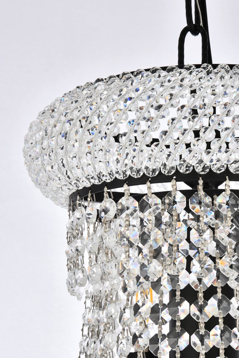 The primo series of hanging fixtures comes in finishes of brilliant chrome or gold or black, which are refracted in the clear crystals.