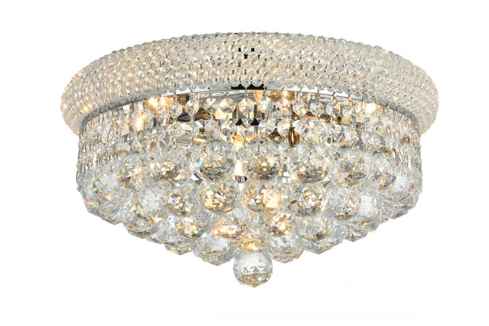 Primo flush-mount fixtures come in finishes of brilliant chrome or gold, which are refracted in the clear crystals
