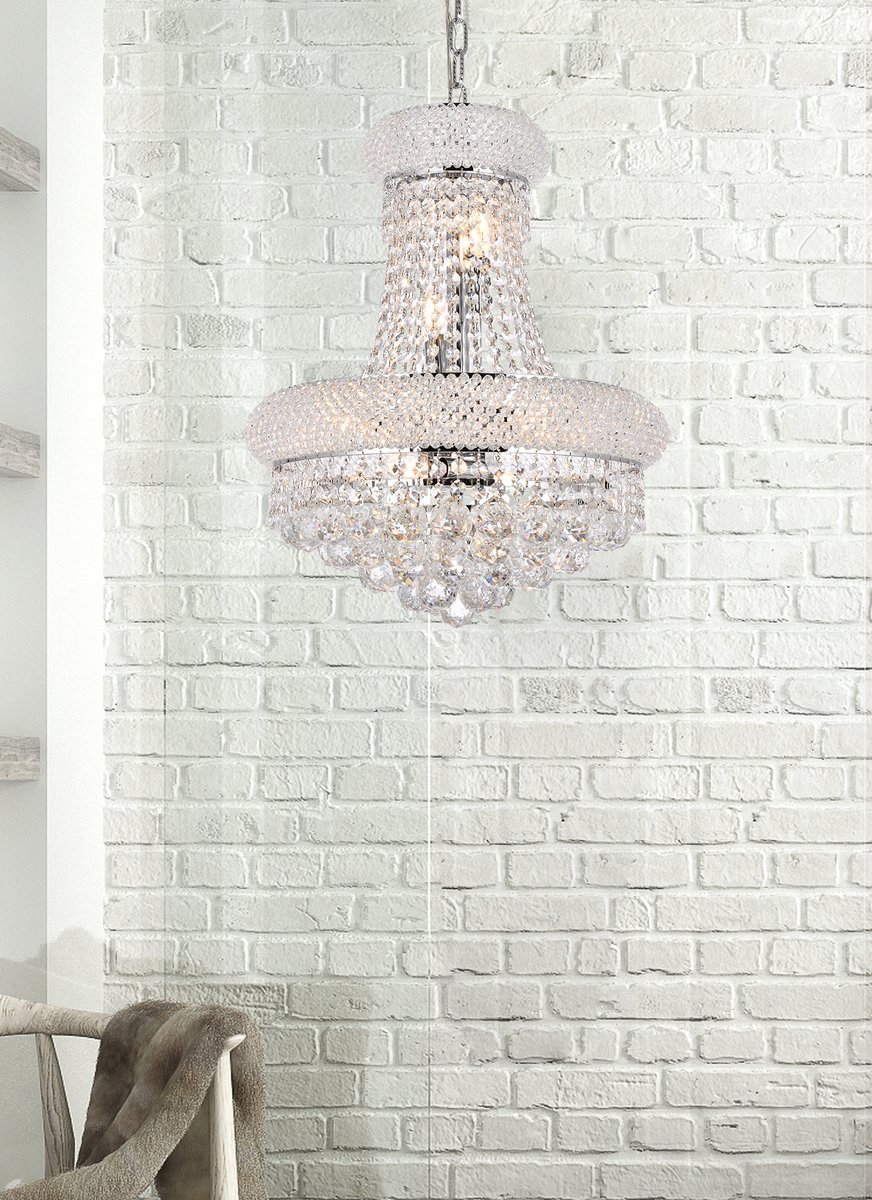 The primo series of hanging fixtures comes in finishes of brilliant chrome or gold, which are refracted in the clear crystals
