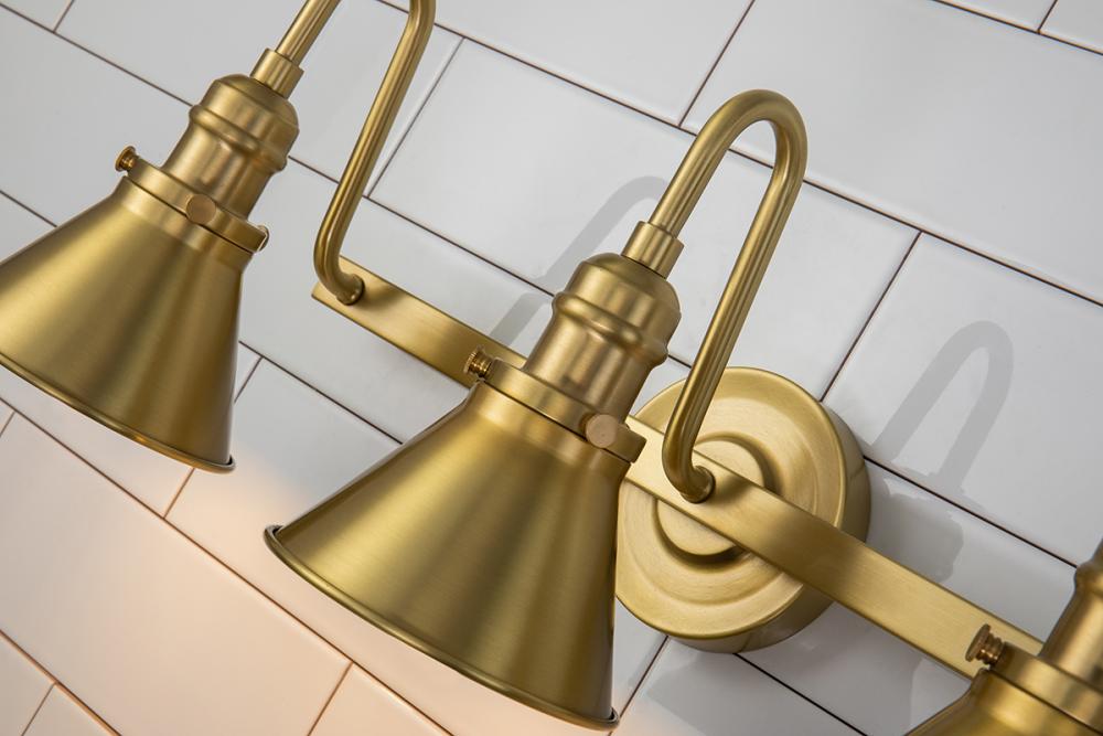 A 3-light aged brass vanity with a high arched arm and cone shades. Its modern farmhouse design suits damp spaces, perfect over mirrors with vintage flair.