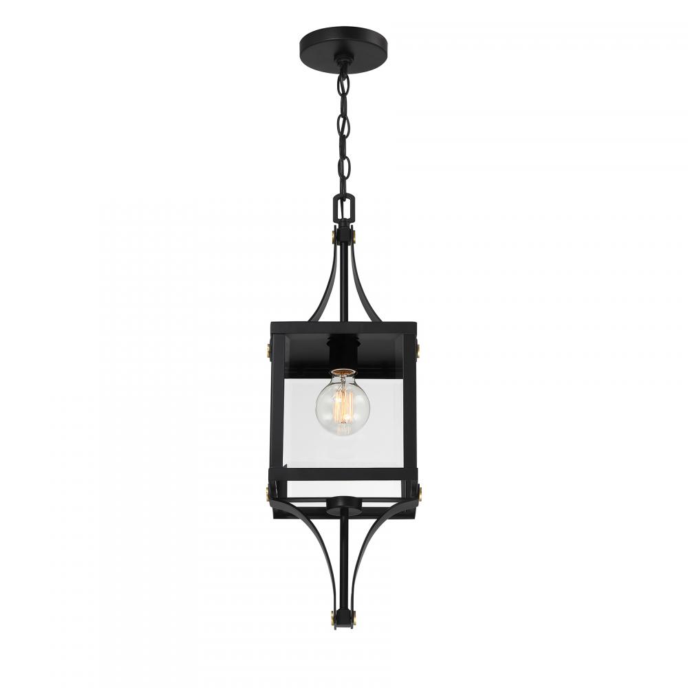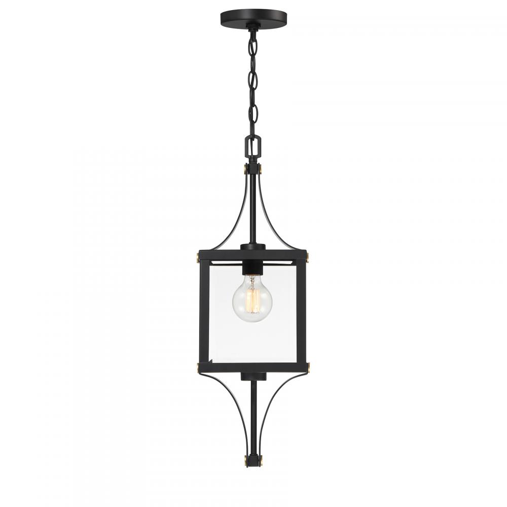 Make your outdoor lighting super fashionable with the Savoy House Raeburn 1-light outdoor hanging lantern. A central cube of beveled clear glass is surrounded by a boldly structured frame finished in Matte Black and adorned with thoughtful detailing in Weathered Brushed Brass. Raeburn is 25" in height and 8.5" in width. Uses one standard size bulb of up to 60 watts. The bulb is not included. Damp area rated.