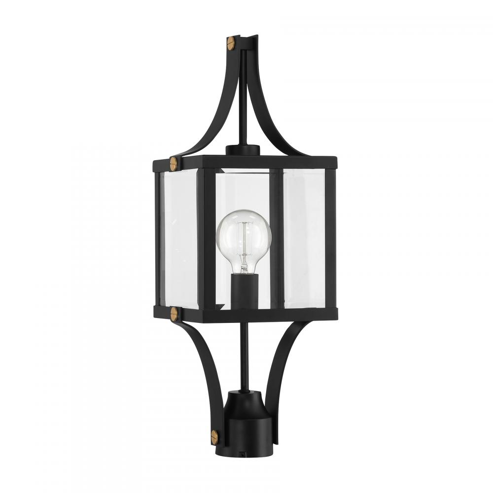 Make your outdoor lighting super fashionable with the Savoy House Raeburn 1-light outdoor post lantern. A central cube of beveled clear glass is surrounded by a boldly structured frame finished in Matte Black and adorned with thoughtful detailing in Weathered Brushed Brass. Raeburn is 23.5" in height and 8.5" in width. Uses one standard size bulb of up to 60 watts. The bulb is not included. Wet area rated.