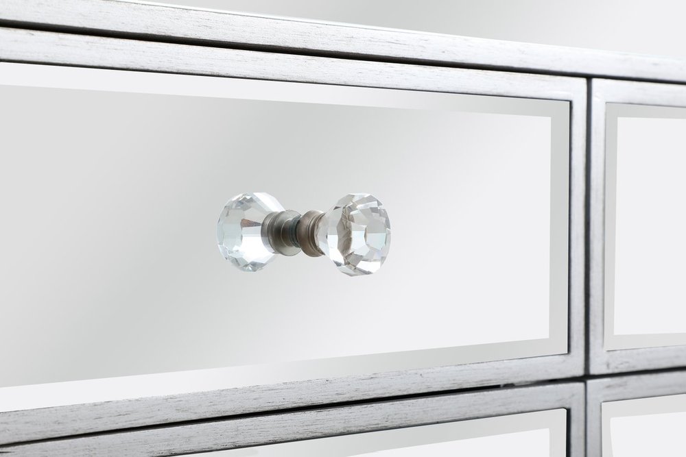 Crafted with mdf, clear mirror panels, and crystal knobs