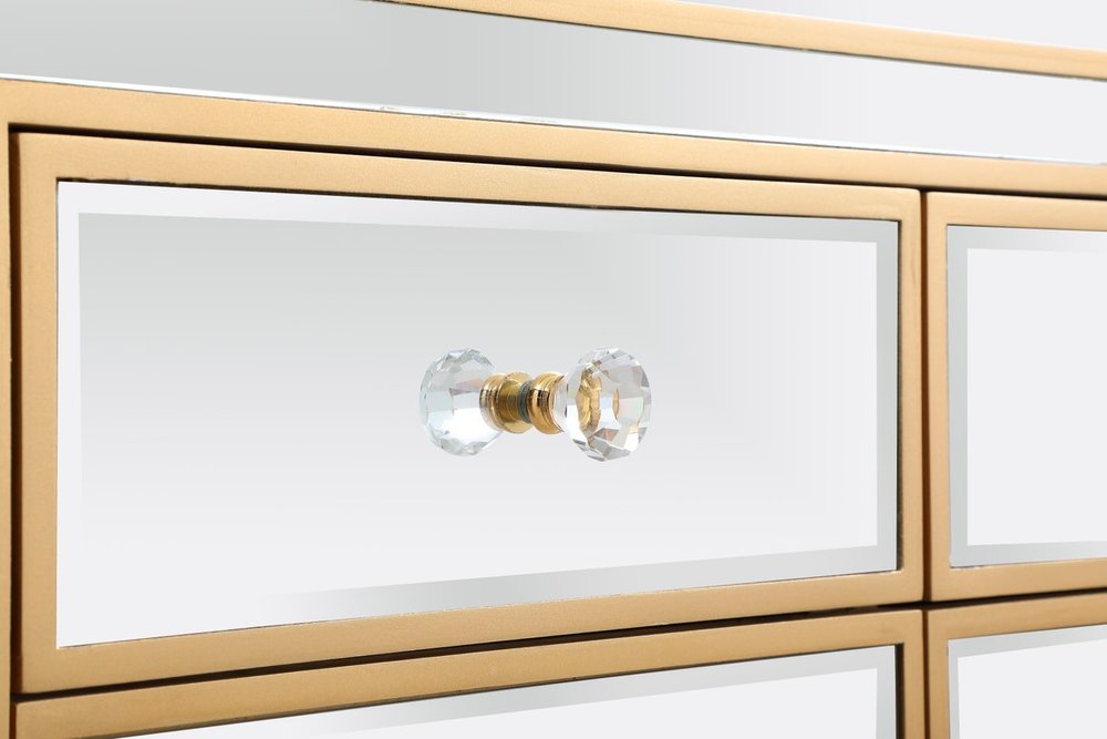 Crafted with mdf, clear mirror panels, and crystal knobs