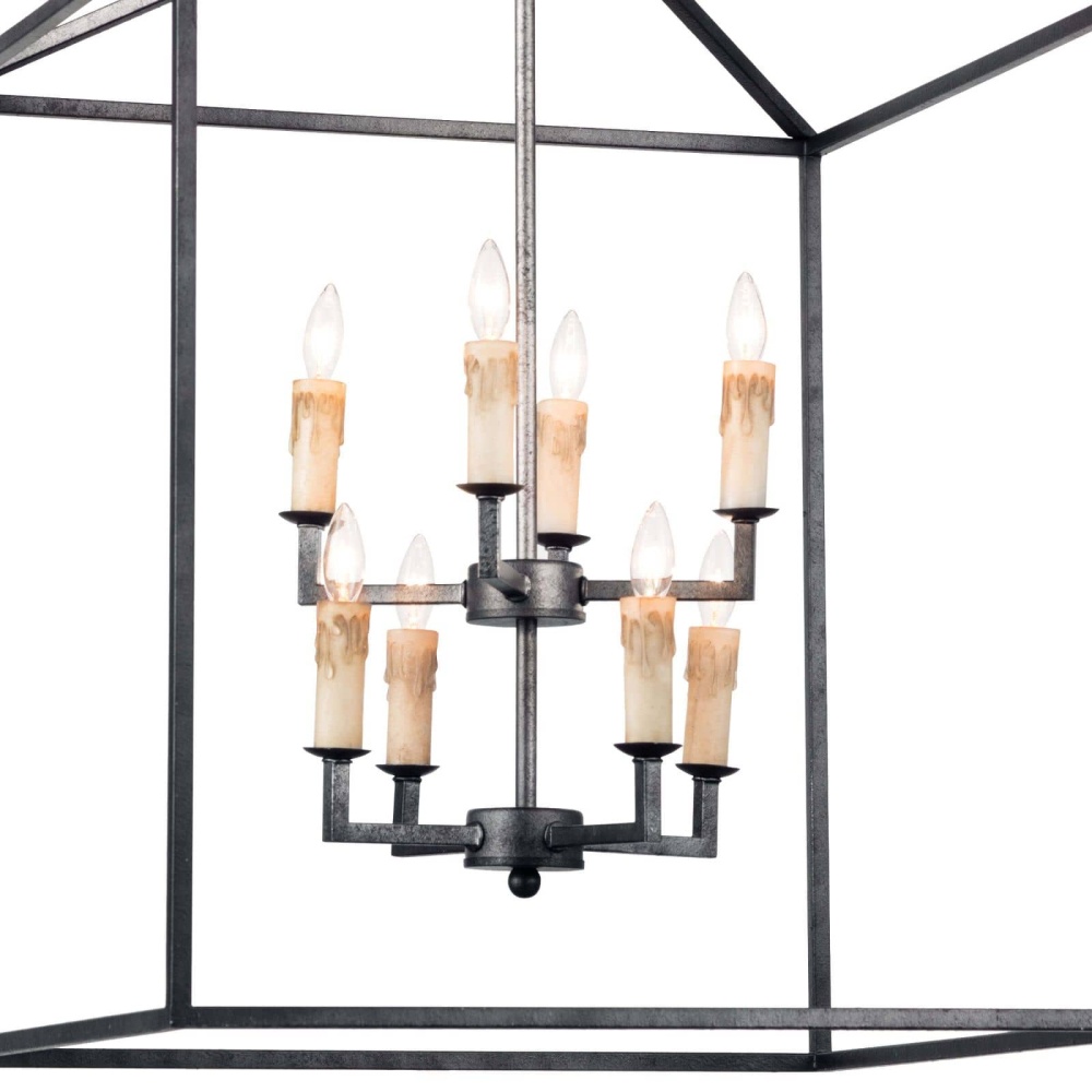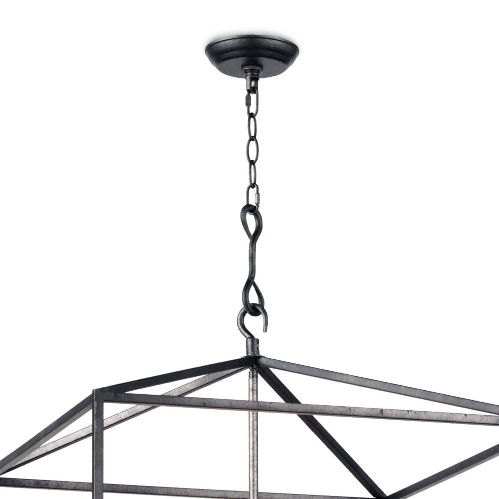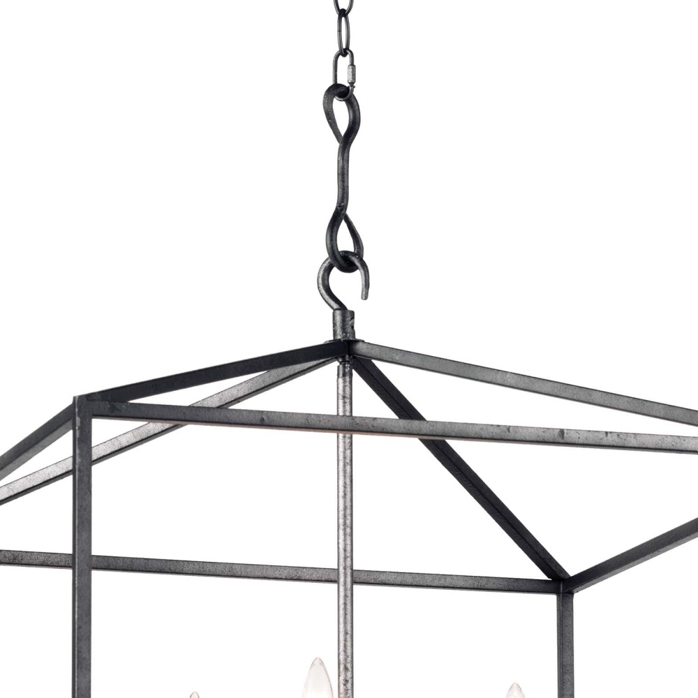 The Cape Lantern wears a wonderfully distressed Blackened Iron finish with a stunning geometric silhouette frame. The candelabra lighting inside creates a rustic modern statement in your foyer, living room, or dining room.