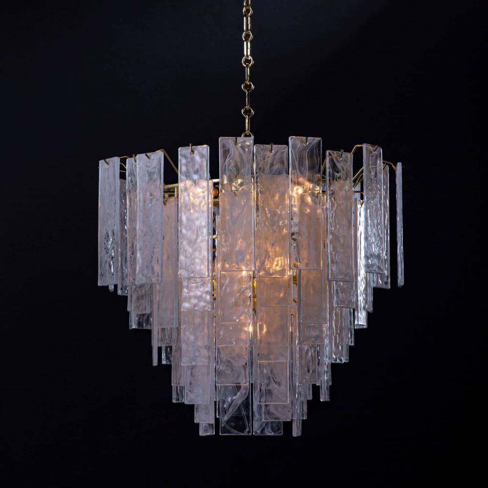 Panes of striking water glass with white swirls adorn the small Glacier Chandelier to create a dynamic piece full of movement. The glass diffuses the light, providing a soft glow to the area around it, perfect for a foyer or living room.