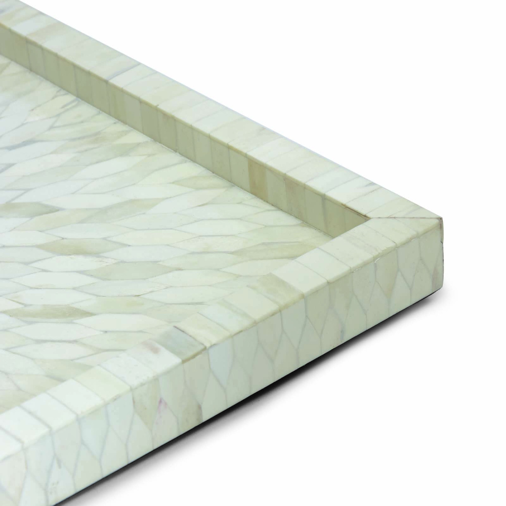 Handcrafted in India, the Montara Square Bone Tray in creamy white catches the eye with a veneer of mosaic bone art in a delicate floral pattern. You’ll find so many reasons to use this unique decorative tray – and never put it away. Perfect for wine and cheese pairings at your next event, to display a collection of meaningful trinkets or a cluster of candles to set the mood.
